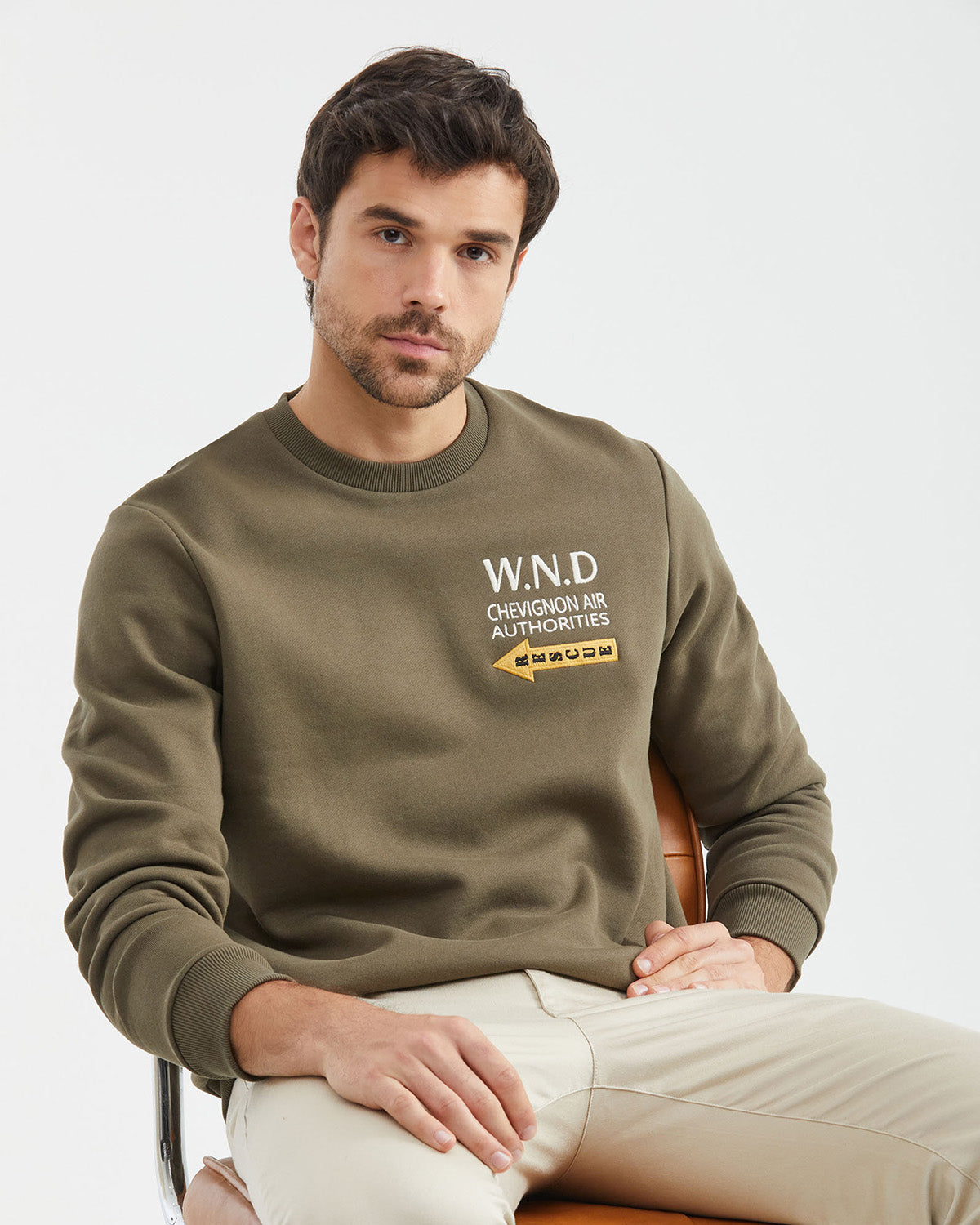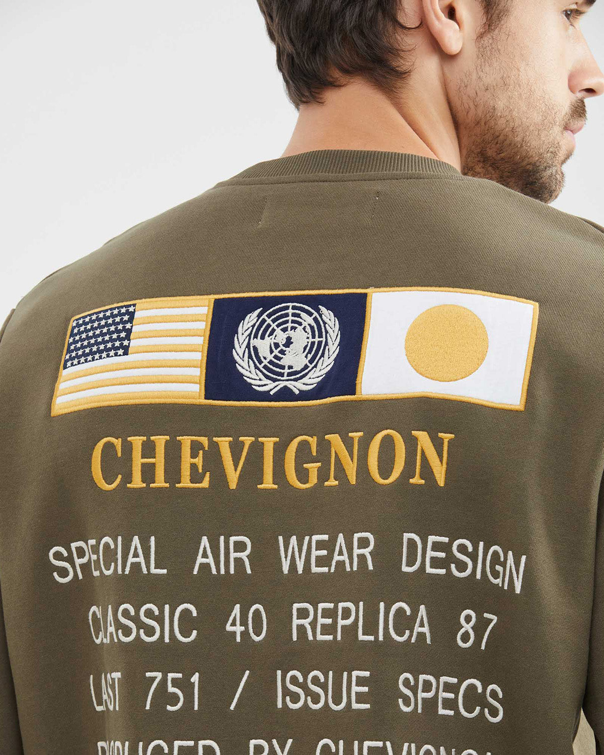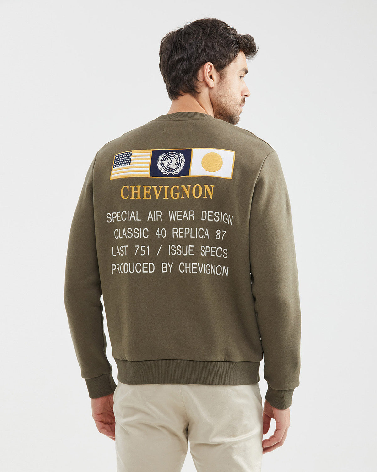 This distinctive men's sweater is classic Chevignon. It is part rugged, part sophisticated. Its unique green hue and gathered cuffs, waist and collar make it stand out, as does the emblem on the upper right.