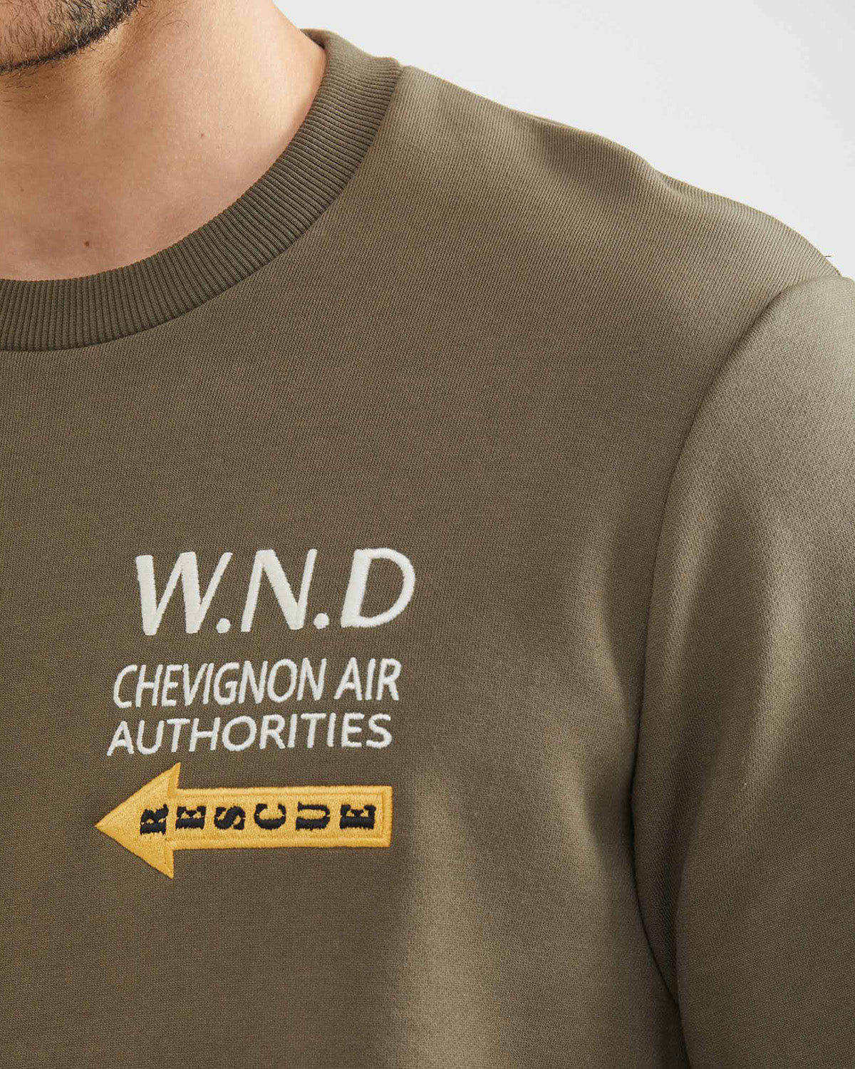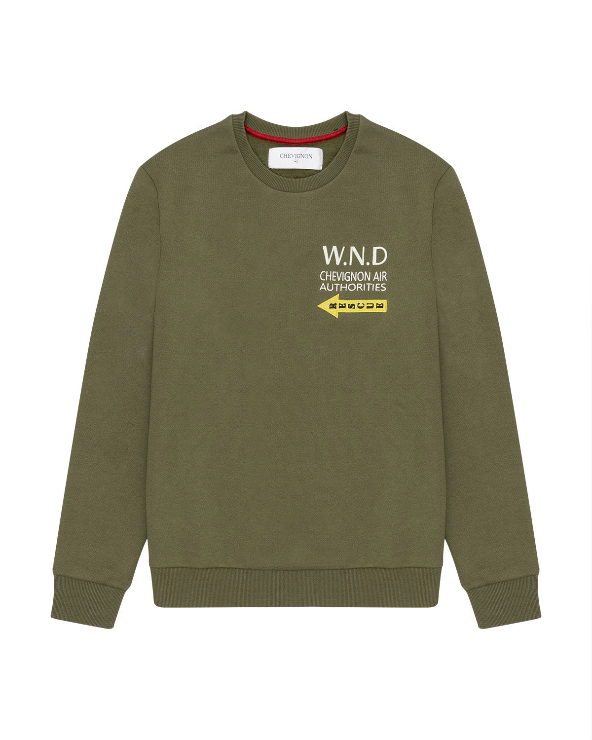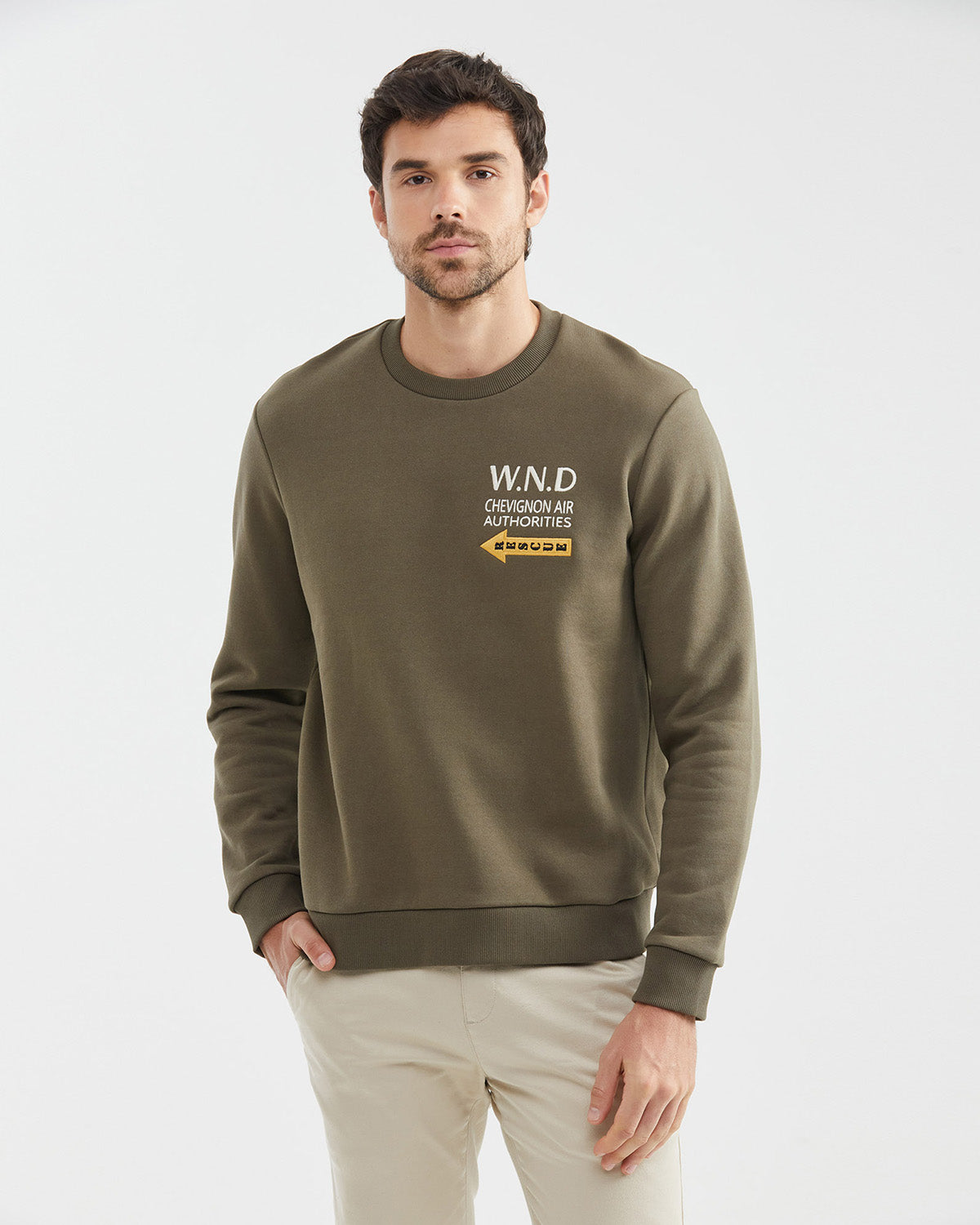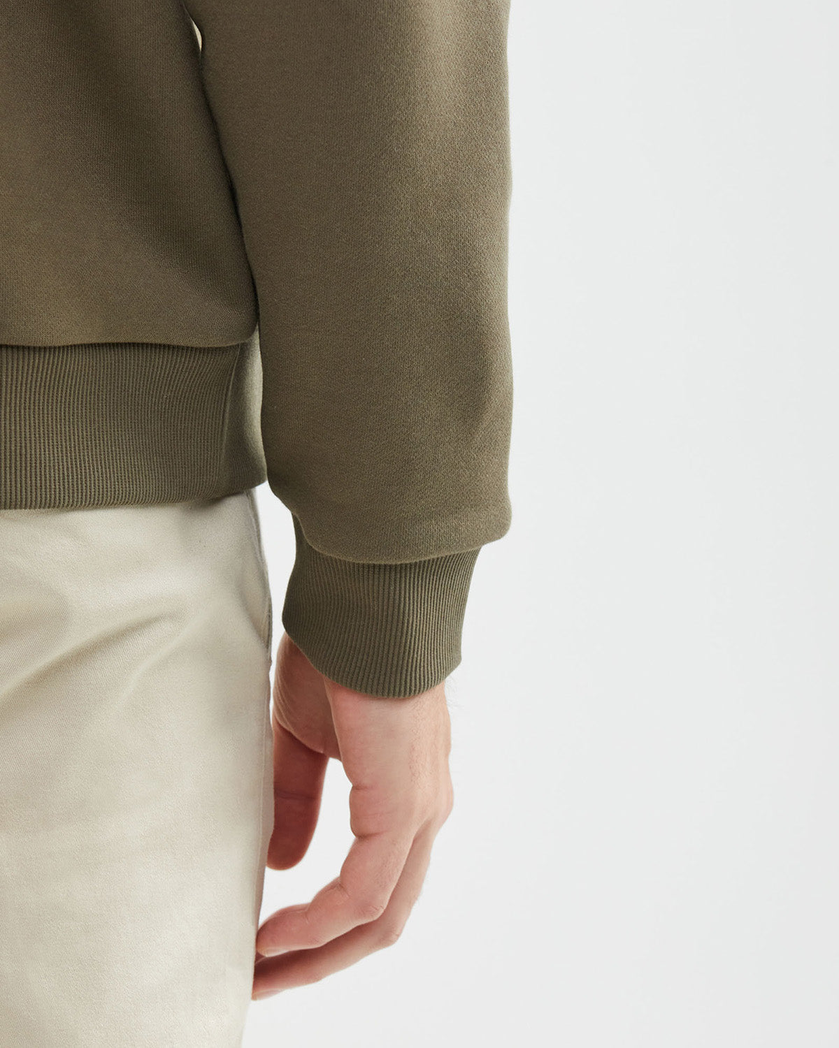 This distinctive men's sweater is classic Chevignon. It is part rugged, part sophisticated. Its unique green hue and gathered cuffs, waist and collar make it stand out, as does the emblem on the upper right.