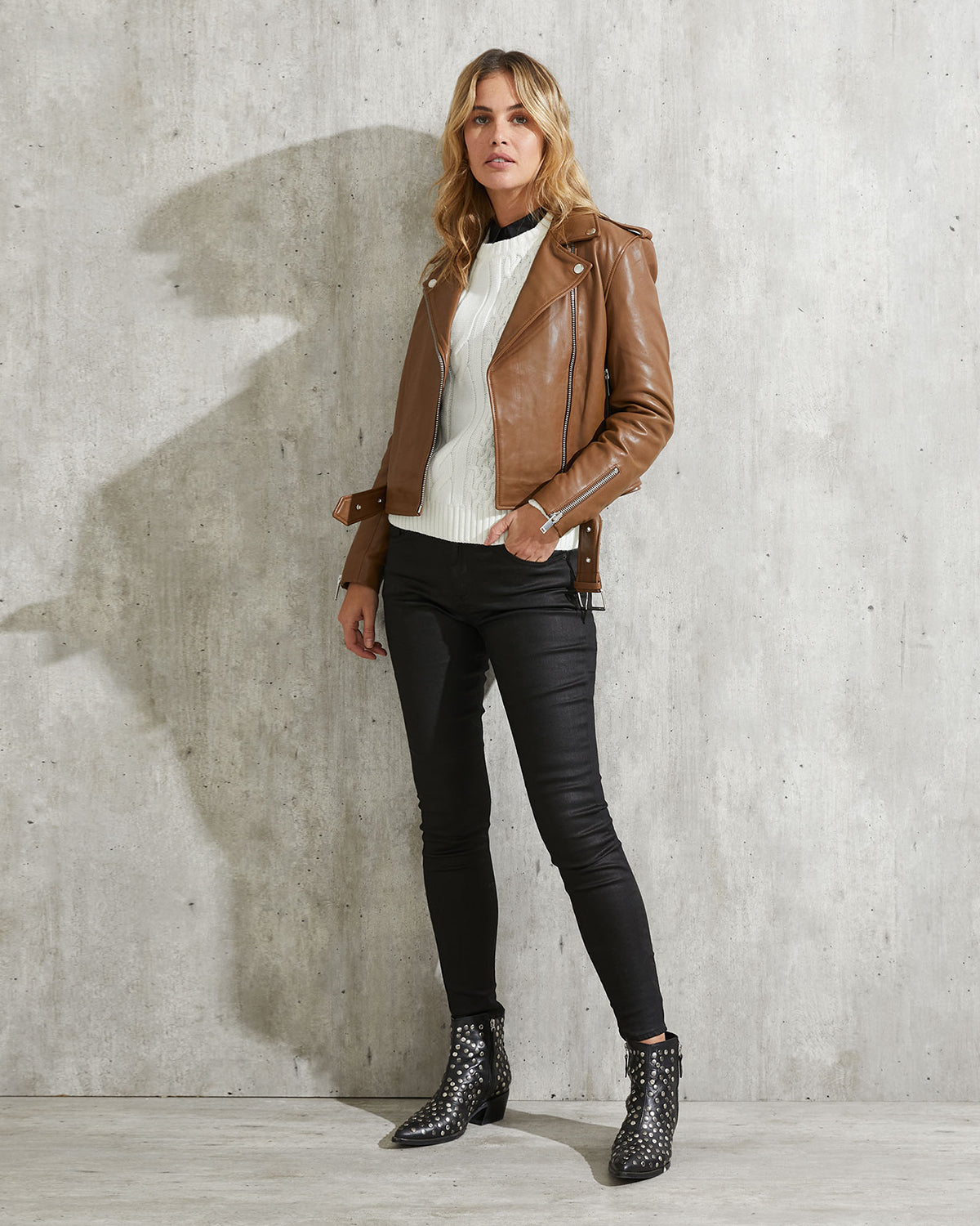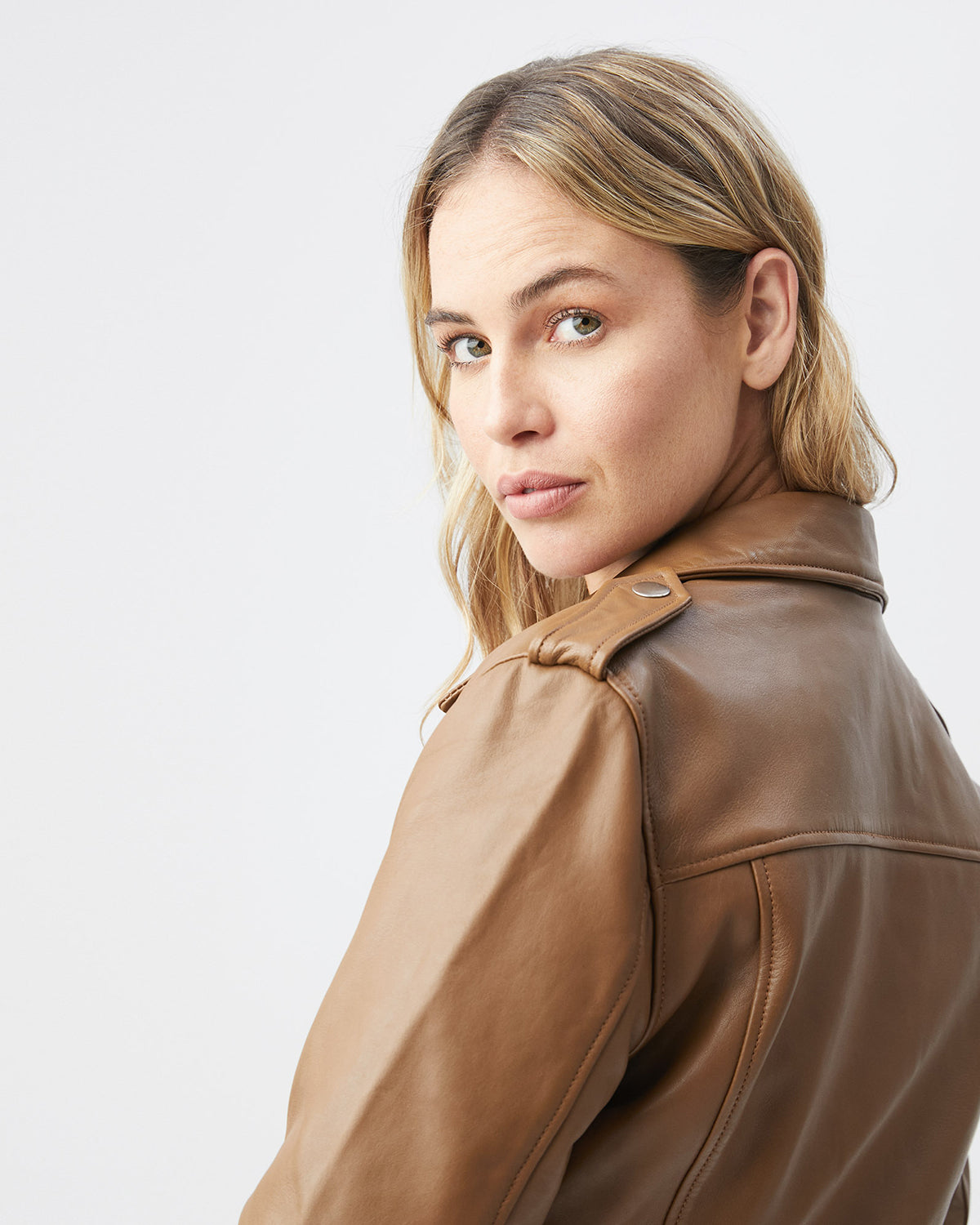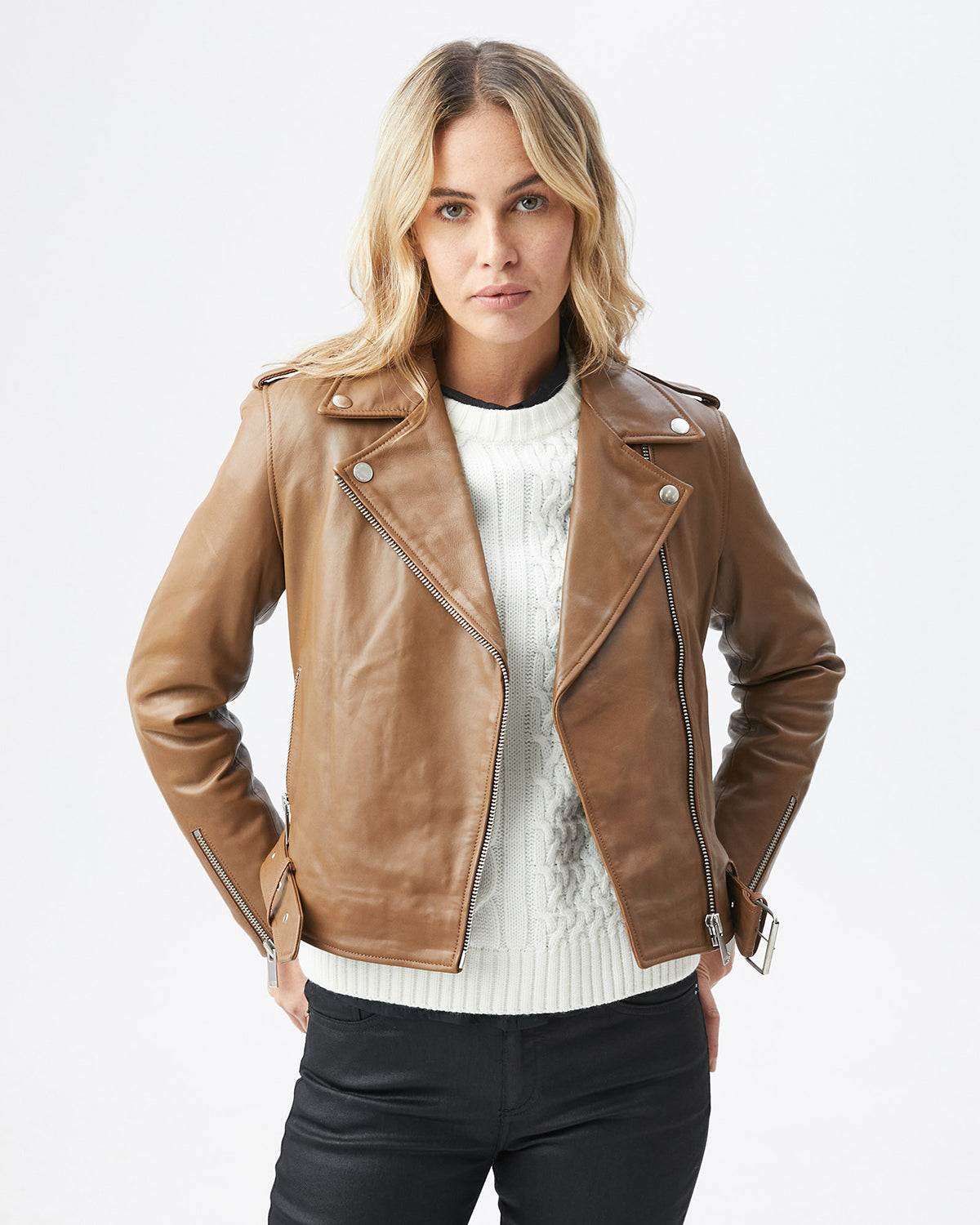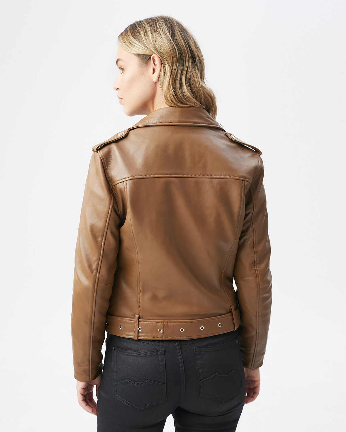 Chevignon brings its legacy of combining a luxe French aesthetic with the undeniable vibe of American ruggedness to the forefront with the debut of its highly anticipated women’s collection in the United States. This brown Classic Biker Leather Jacket showcases the brand’s commitment to quality, style, and functionality.