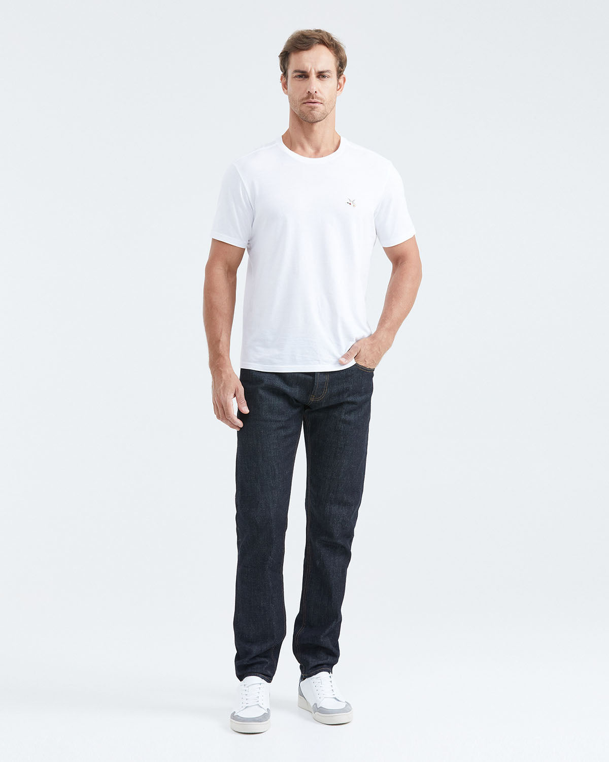 • The leather brand tag at the waist marks your commitment to quality, while the reinforced triple-button fly and eight rivets at stress points ensure these jeans maintain their precision fit through countless wears.