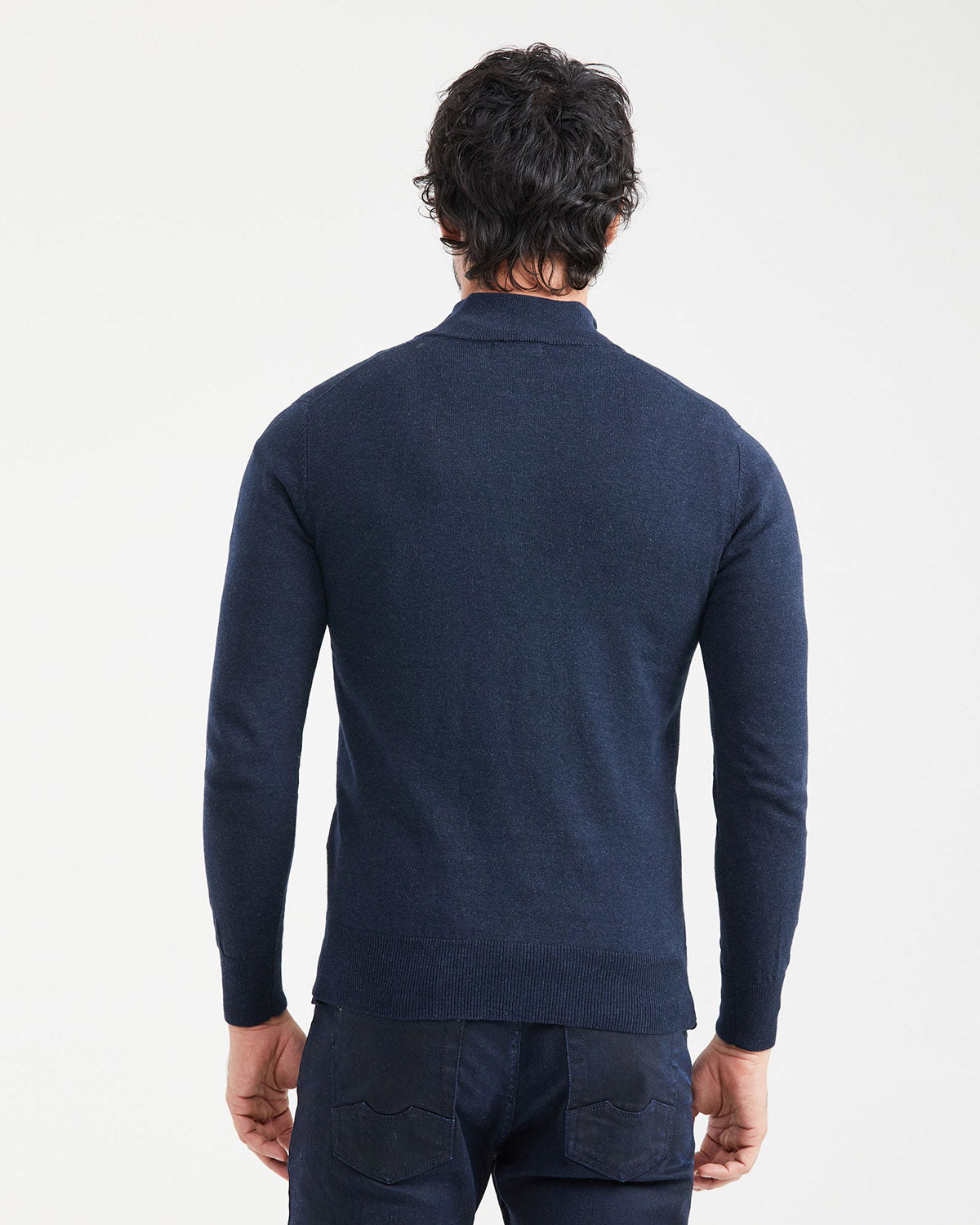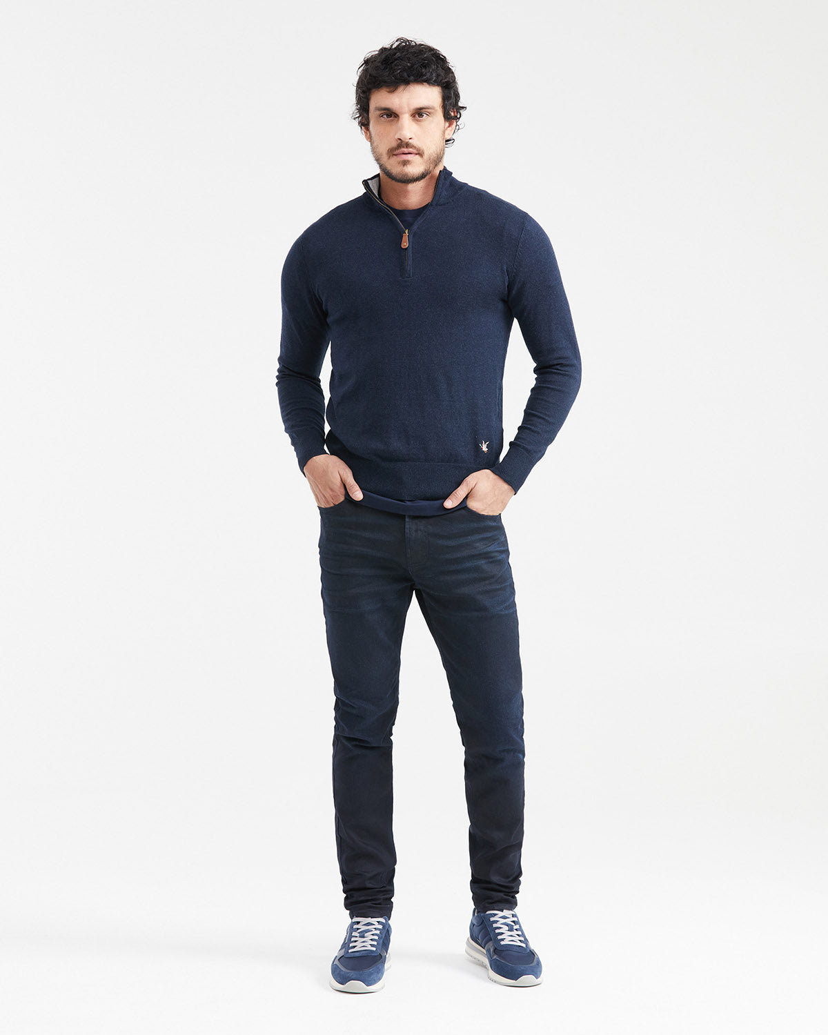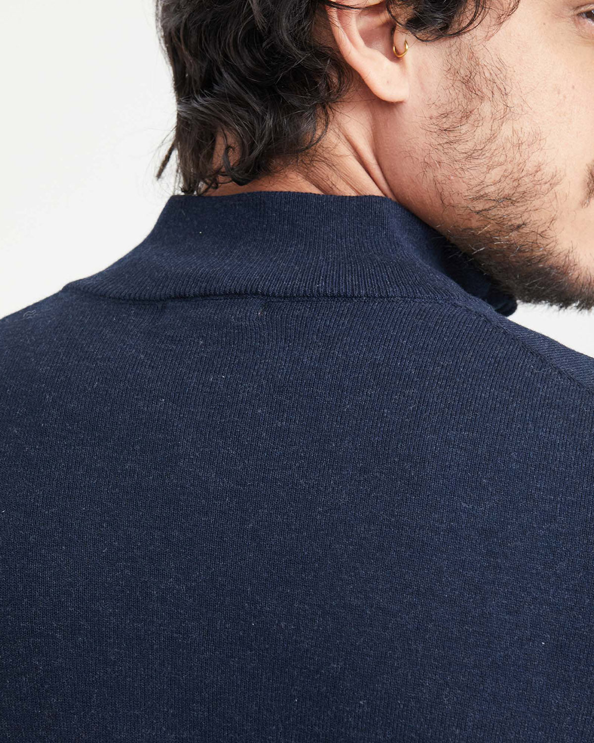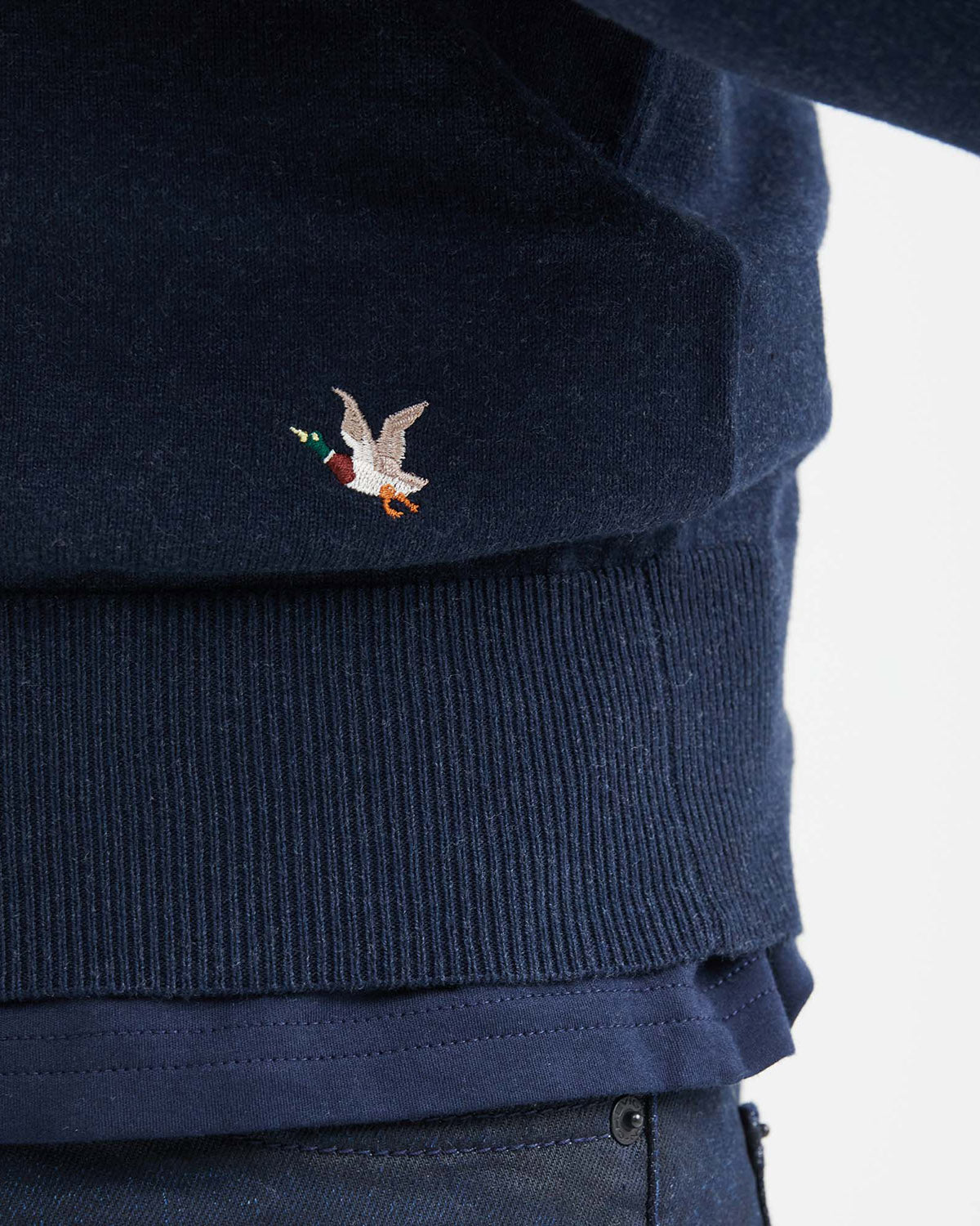 BASIC KNIT SWEATER, FULL FASHION TECHNIQUE, JERSEY KNIT, NERU COLLAR WITH CONTRAST INTERIOR, HALF PLACKET WITH METAL ZIPPER AND LEATHER PULLER, HEATHER FIBER, LIGHT GAUGE, COLORED EMBROIDERED DUCK ON THE FRONT, LOWER LEFT SIDE.