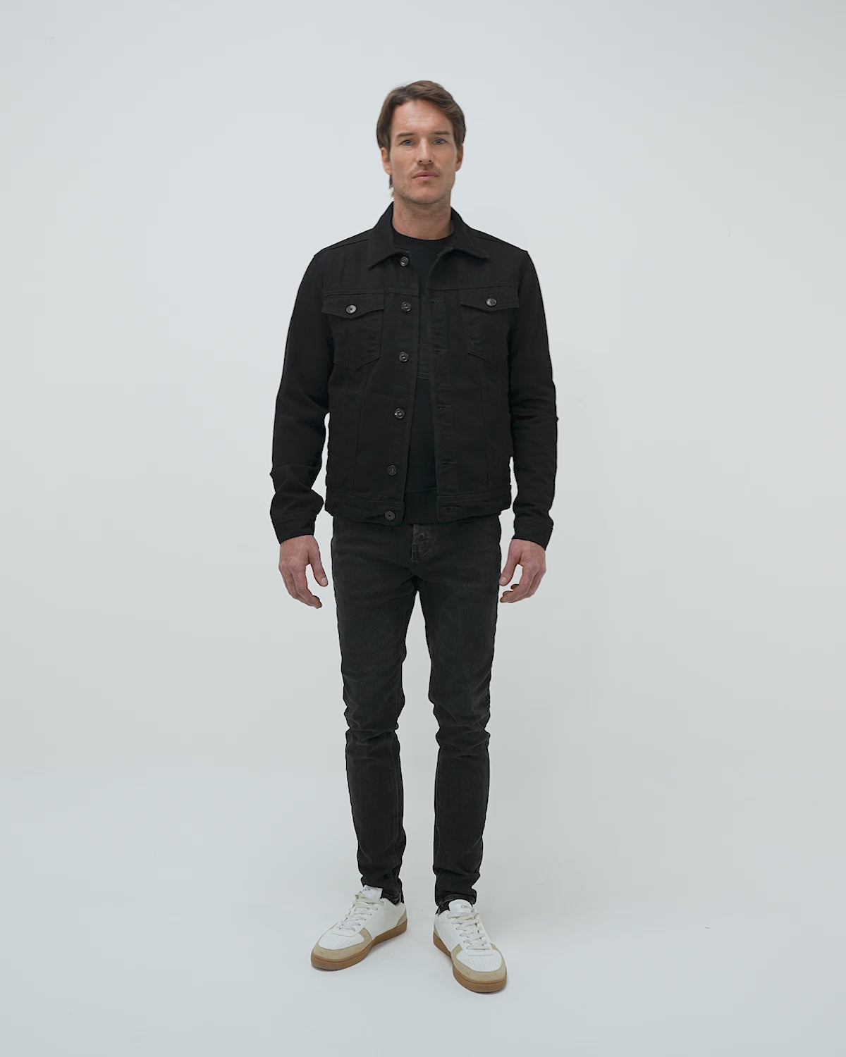 Upgrade your wardrobe with our sophisticated BLACK DENIM JACKET. Made with 100% cotton, it features two flap pockets at the chest with button closures and two slit pockets at the hip.
