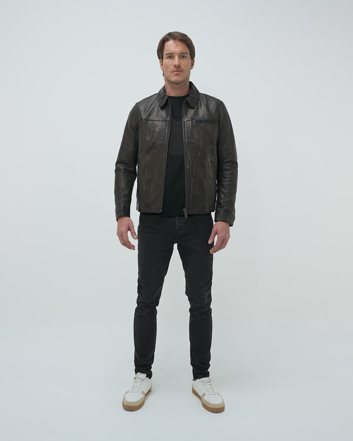Introducing our Blouson Bike Jacket in black, crafted from luxurious vegetable-tanned lambskin leather for a supple and comfortable fit. Featuring a polo collar, double slider zip fastening, and multiple pockets including a zipped chest pocket and 2 interior pockets.