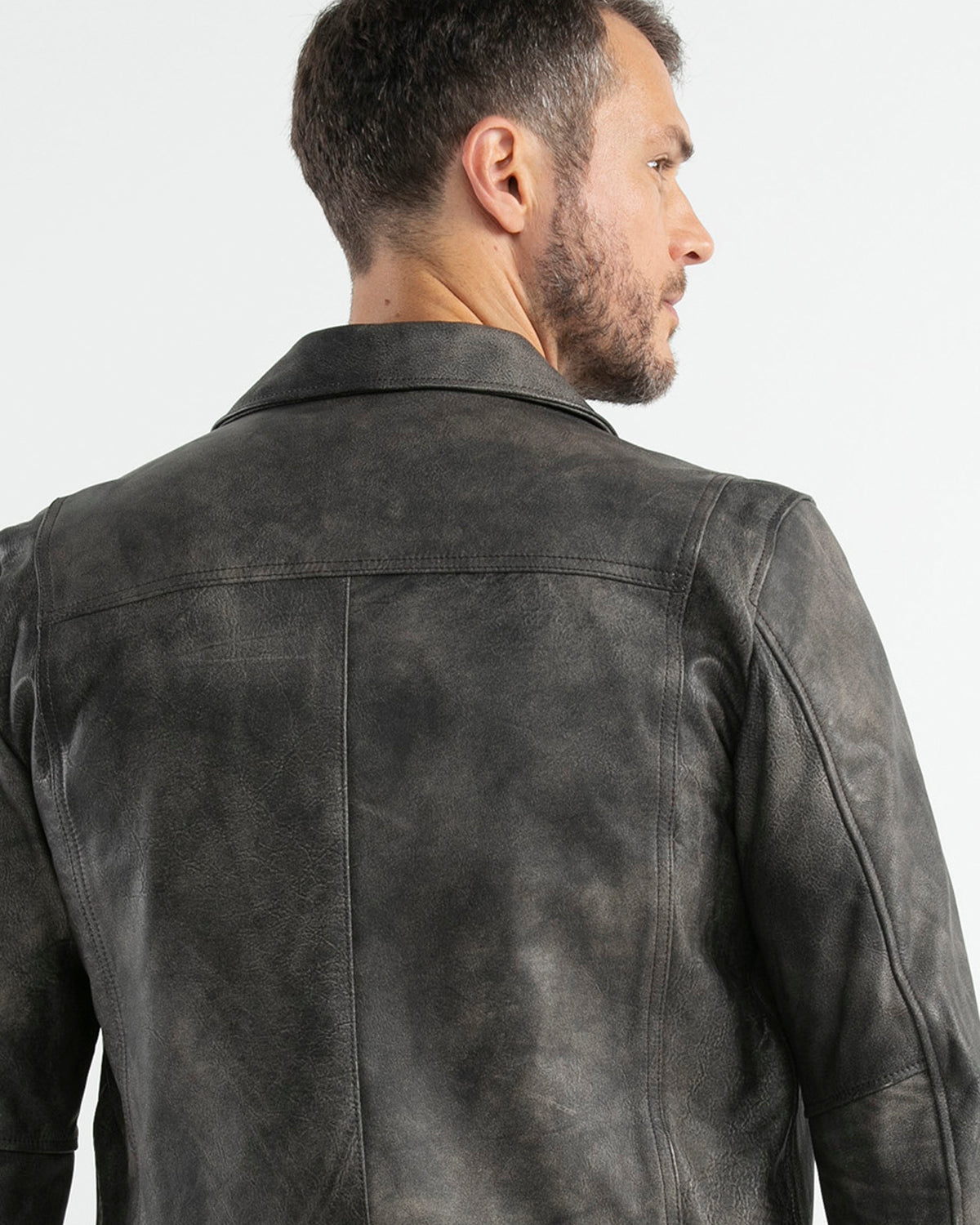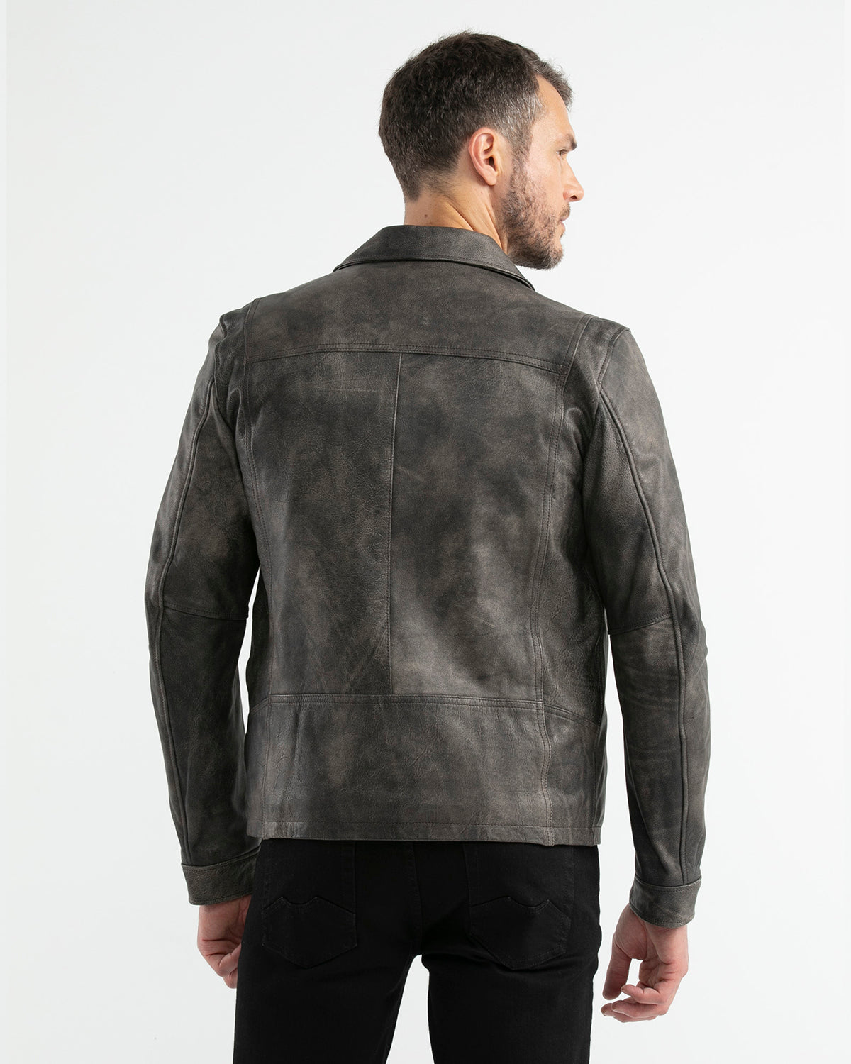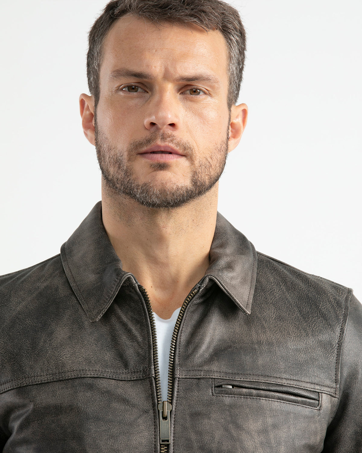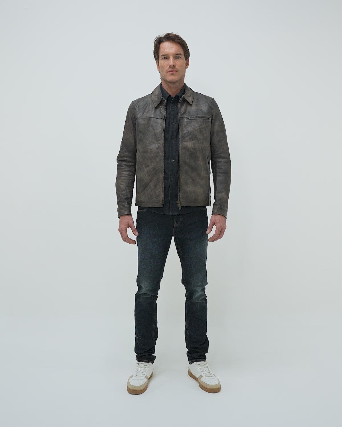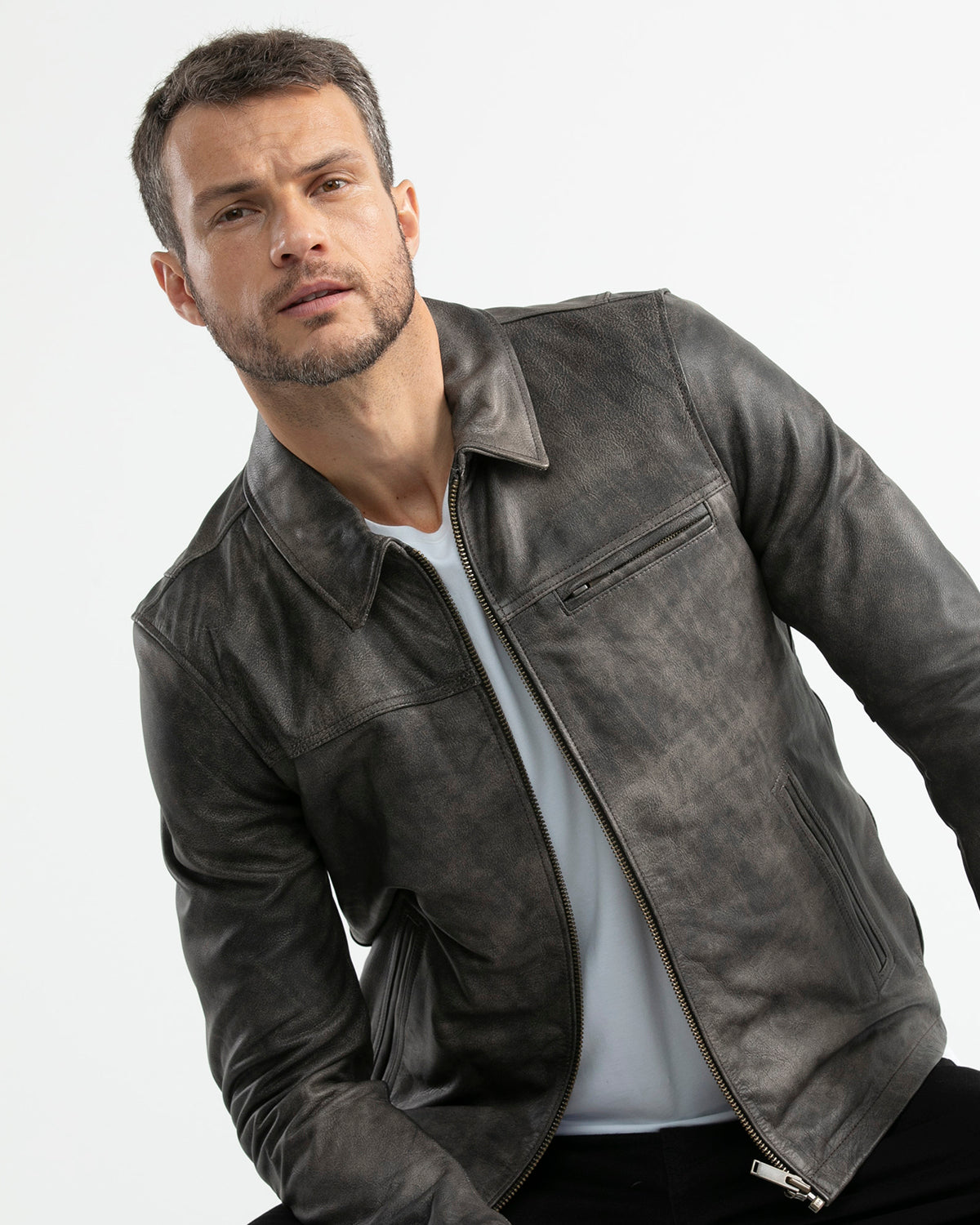 Introducing our Blouson Bike Jacket in charcoal, crafted from luxurious vegetable-tanned lambskin leather for a supple and comfortable fit. Featuring a polo collar, double slider zip fastening, and multiple pockets including a zipped chest pocket and 2 interior pockets.