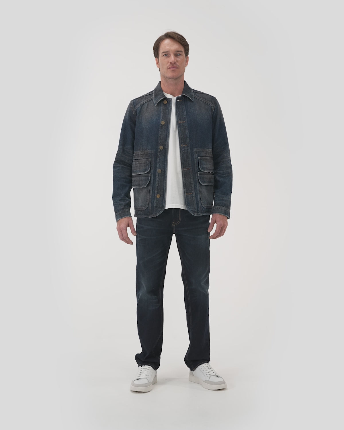 This dark blue denim jacket is unique in its design, following in the footsteps of its brother, the dark blue jeans. It features a subtle fade and distintive two-zipper pockets. This jean jacket is ideal for cool spring nights. Or, layer a hoodie underneath in the colder winter months—it's a staple that can transcend seasons.