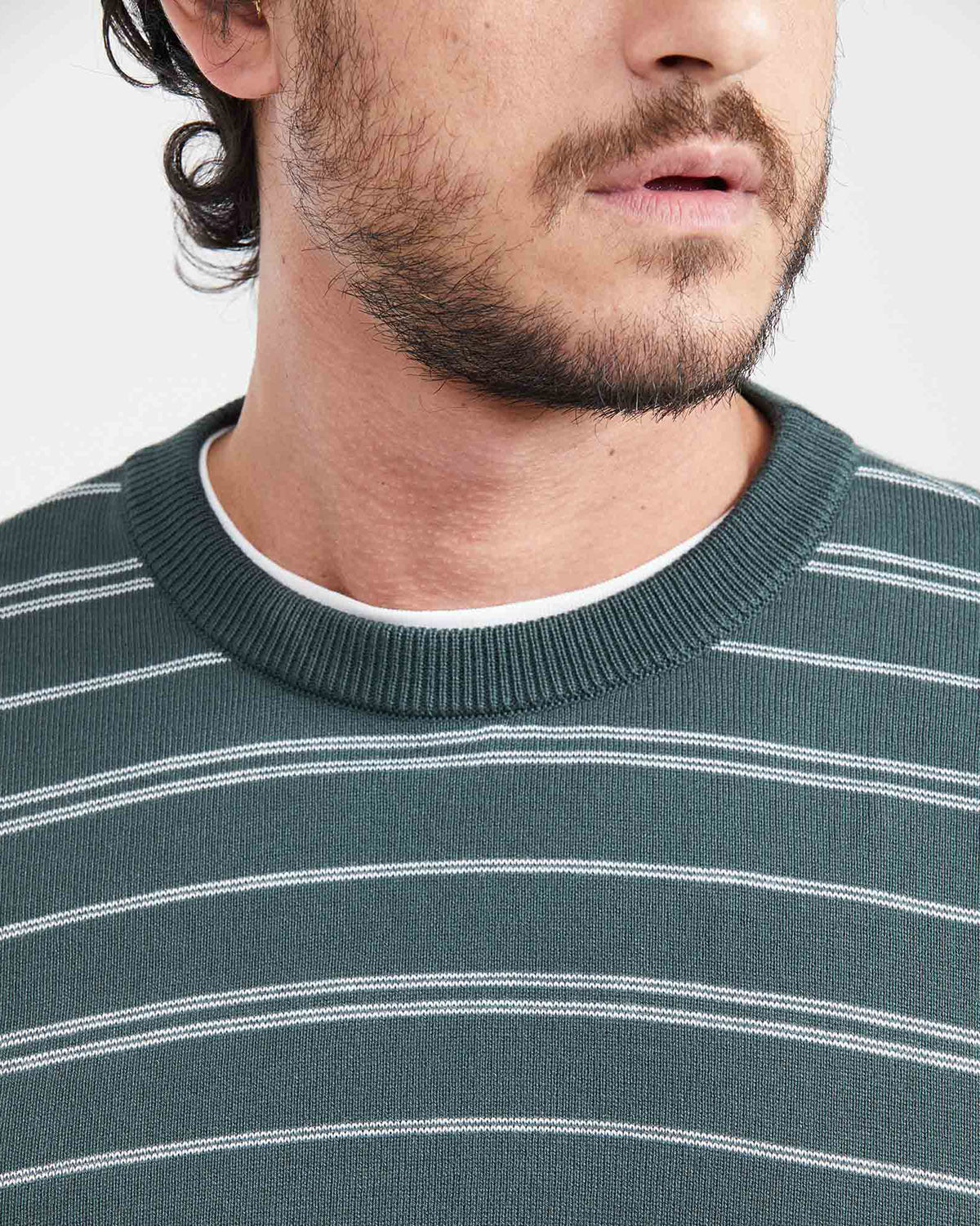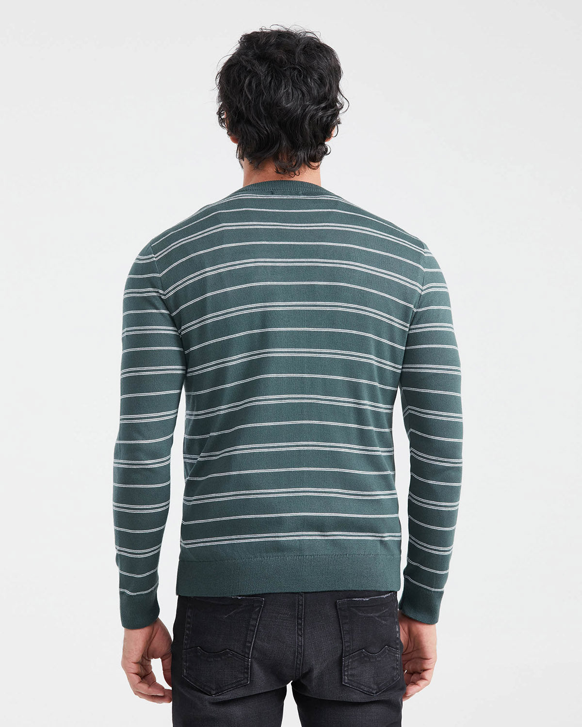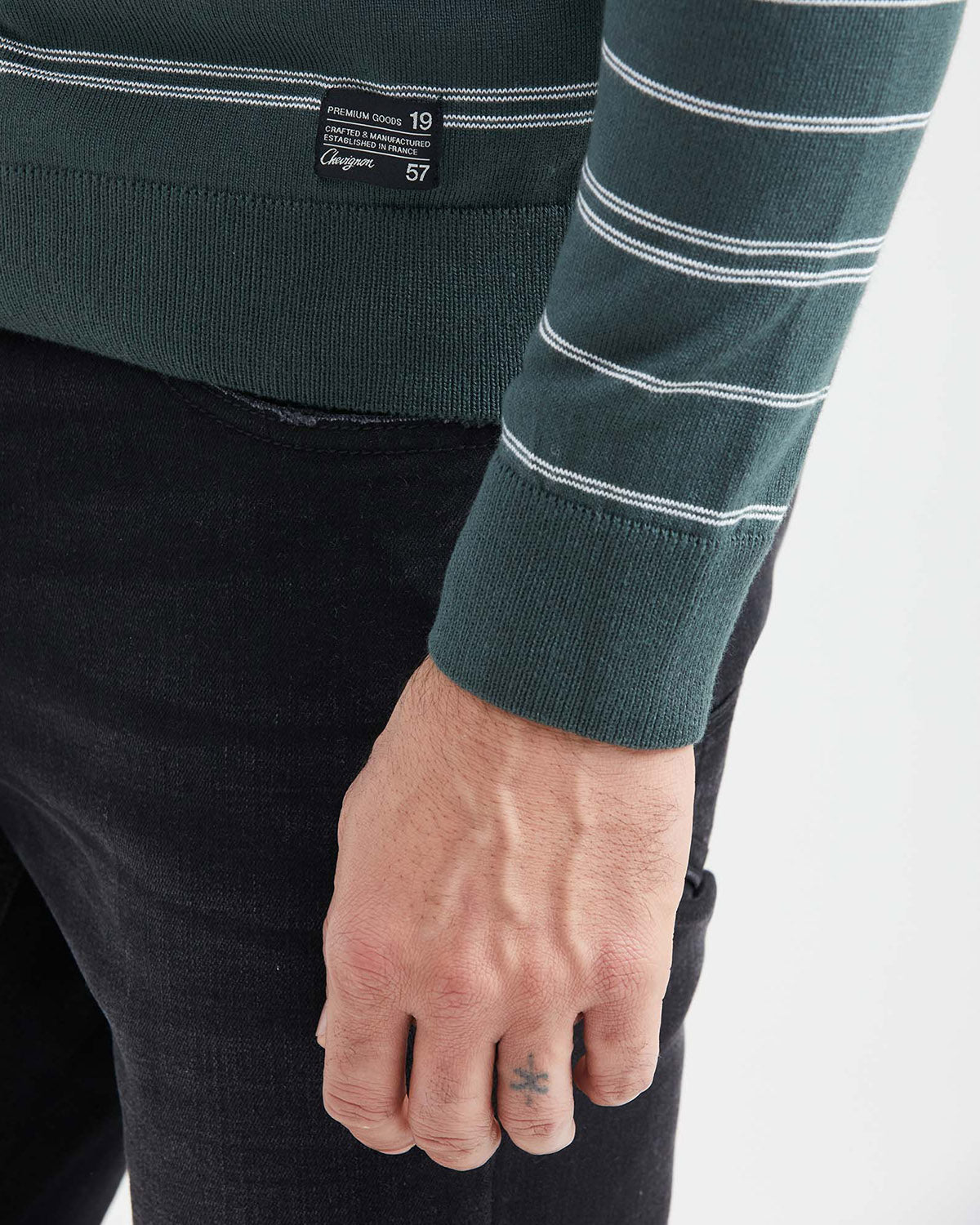 This green and white men’s knit sweater is more than just a piece of clothing, it is part of a fashion journey–included in a collection in which the pieces tell a story of relaxation, sophistication, and handsome beauty. It takes its design cue from resort wear, crafted from super-lightweight jersey fabric with a modal blend, which is universally celebrated for its silky softness and breathable, cool-touch feel. It's classic with a traditional round-neck silhouette but also features a modern mini-stripe design. Perfect for the temperate spring/summer weather, its fine light gauge knit offers an easy drape, while the ribbed collar, cuffs, and hem add a structured yet relaxed finish. Featuring a discreet Chevignon knit label, this striped sweater seamlessly weaves into Chevignon’s timeless narrative of style and effortless elegance.