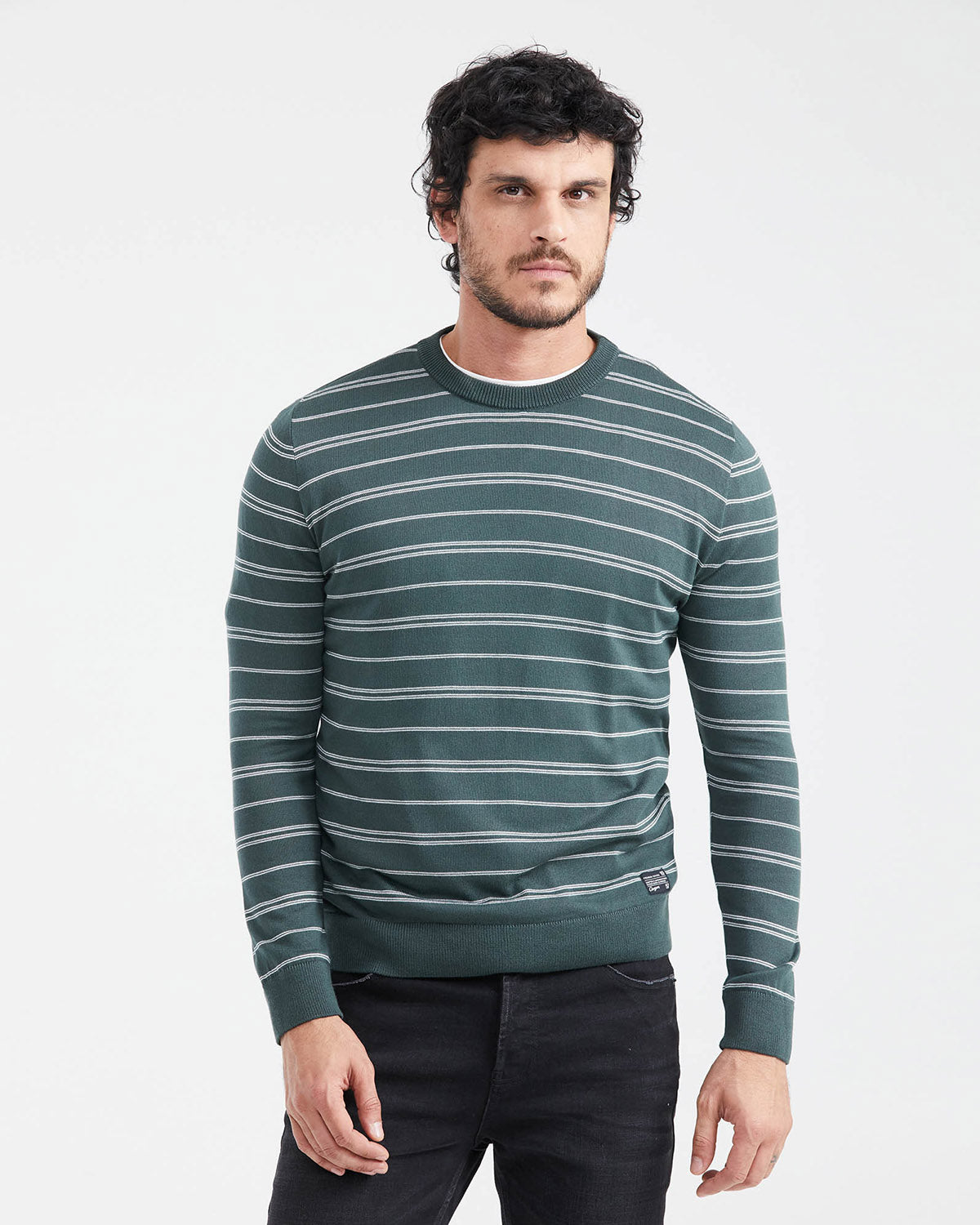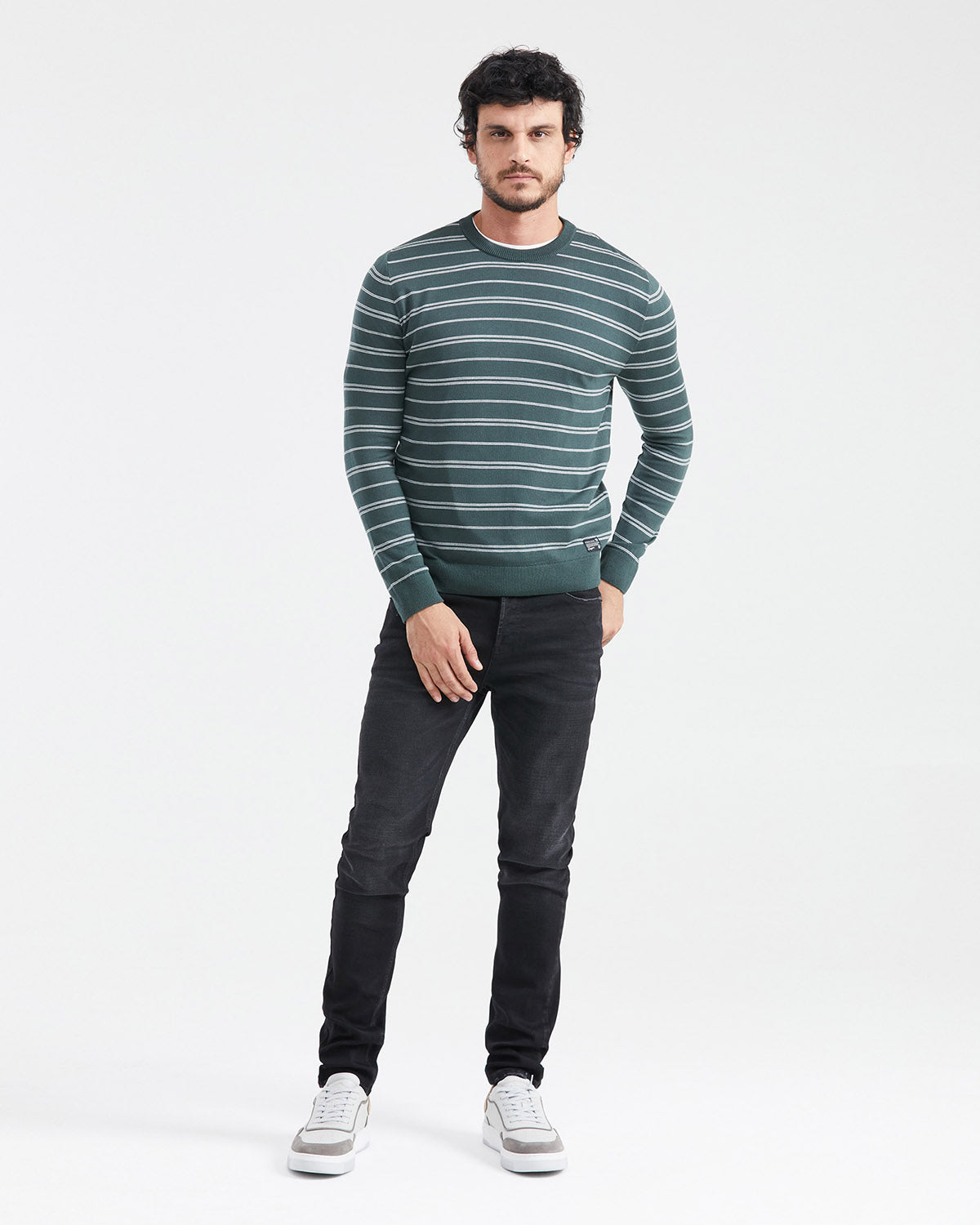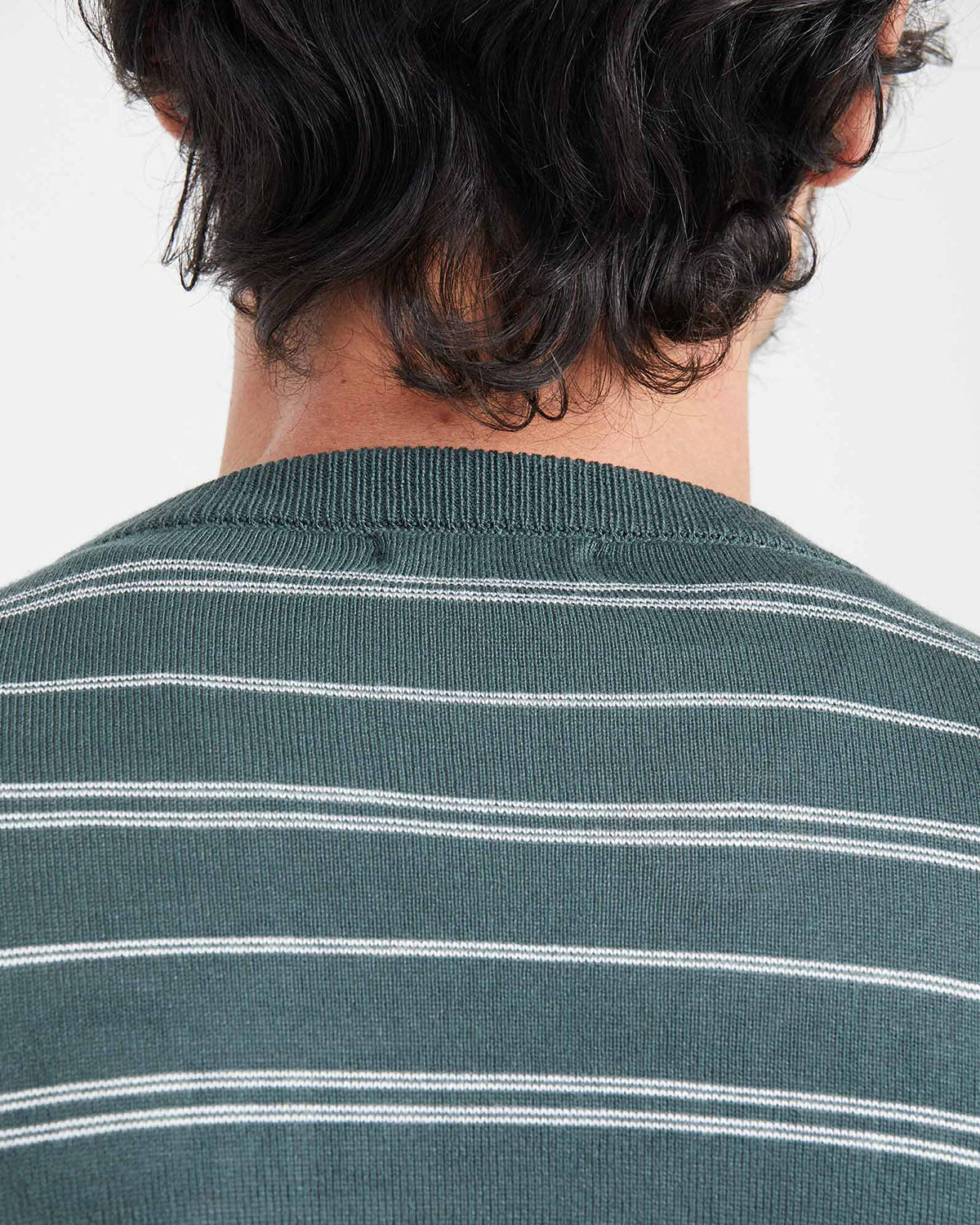 This green and white men’s knit sweater is more than just a piece of clothing, it is part of a fashion journey–included in a collection in which the pieces tell a story of relaxation, sophistication, and handsome beauty. It takes its design cue from resort wear, crafted from super-lightweight jersey fabric with a modal blend, which is universally celebrated for its silky softness and breathable, cool-touch feel. It's classic with a traditional round-neck silhouette but also features a modern mini-stripe design. Perfect for the temperate spring/summer weather, its fine light gauge knit offers an easy drape, while the ribbed collar, cuffs, and hem add a structured yet relaxed finish. Featuring a discreet Chevignon knit label, this striped sweater seamlessly weaves into Chevignon’s timeless narrative of style and effortless elegance.