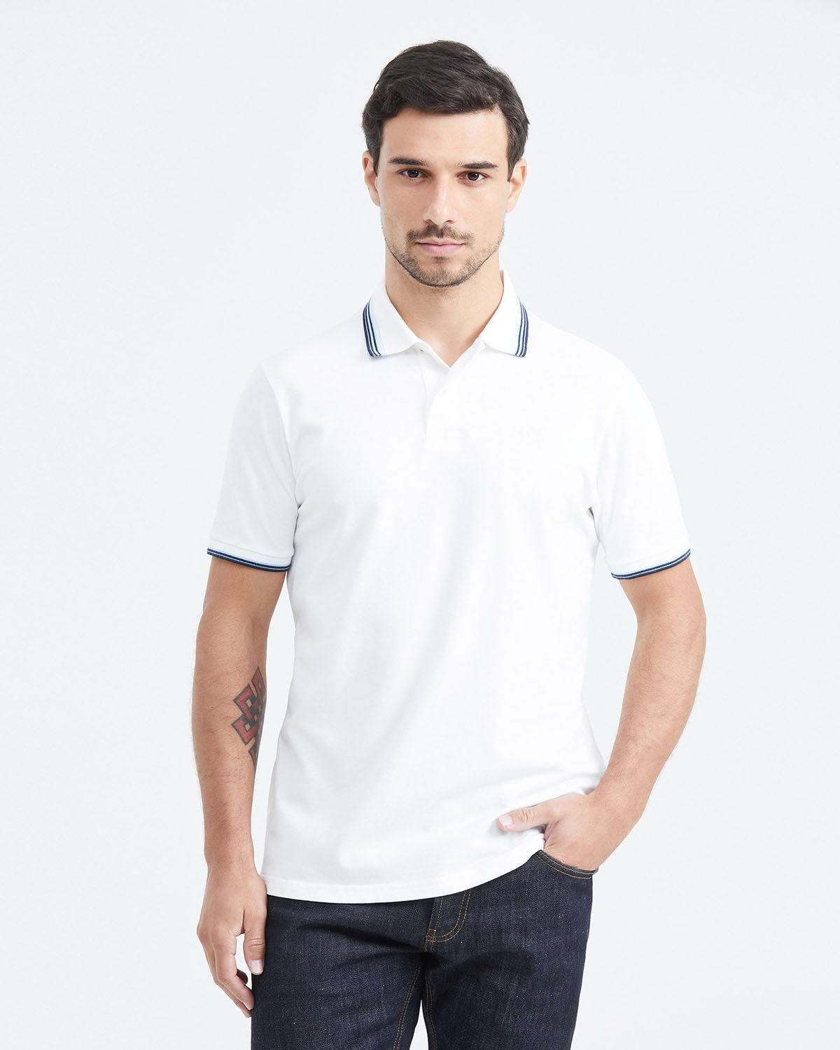 Nothing says classic like a white, short-sleeved “polo” shirt. This staple should be part of every man’s wardrobe. And Chevignon has taken an elevated approach to its design, adding thin blue stripes to the collar and sleeves.