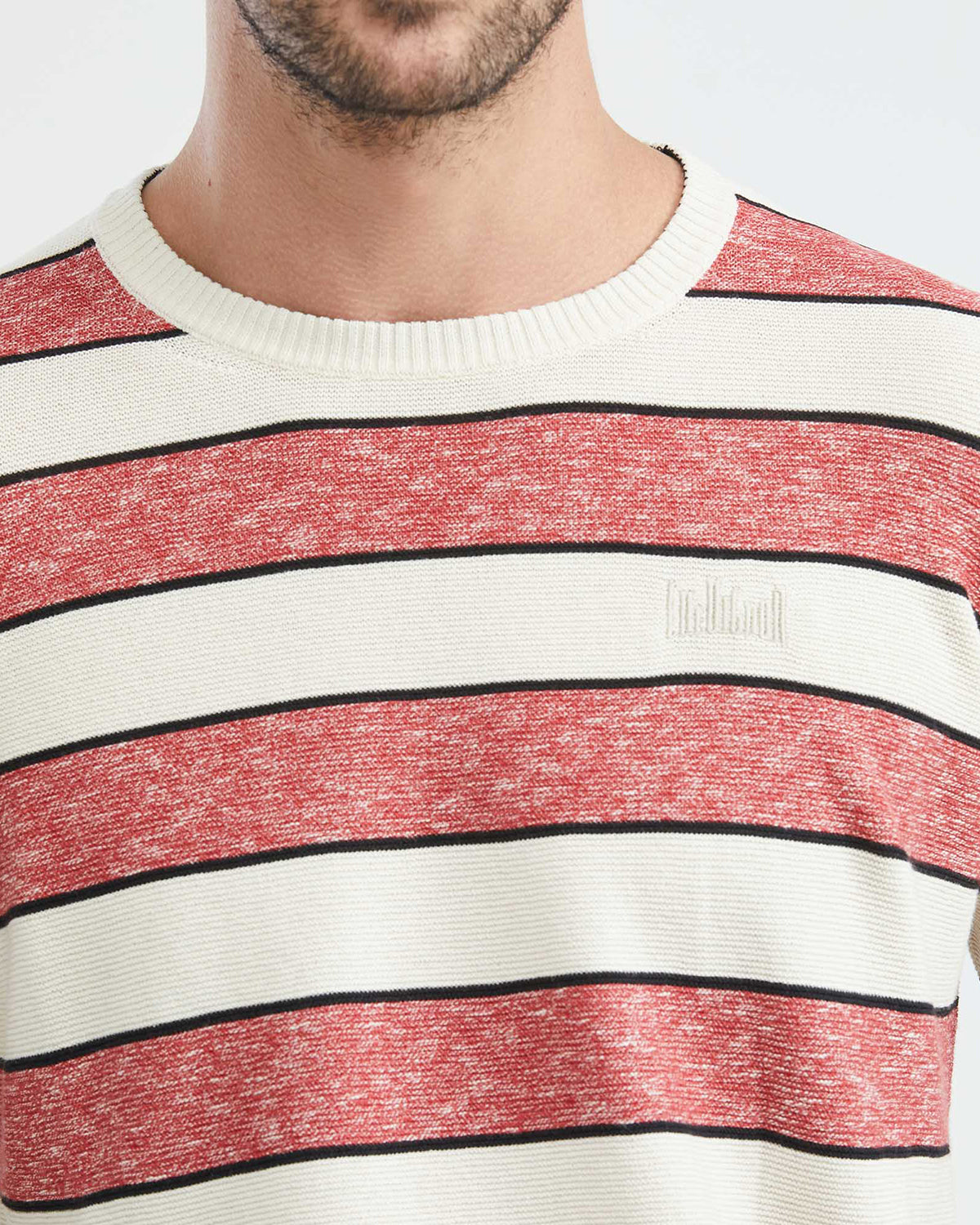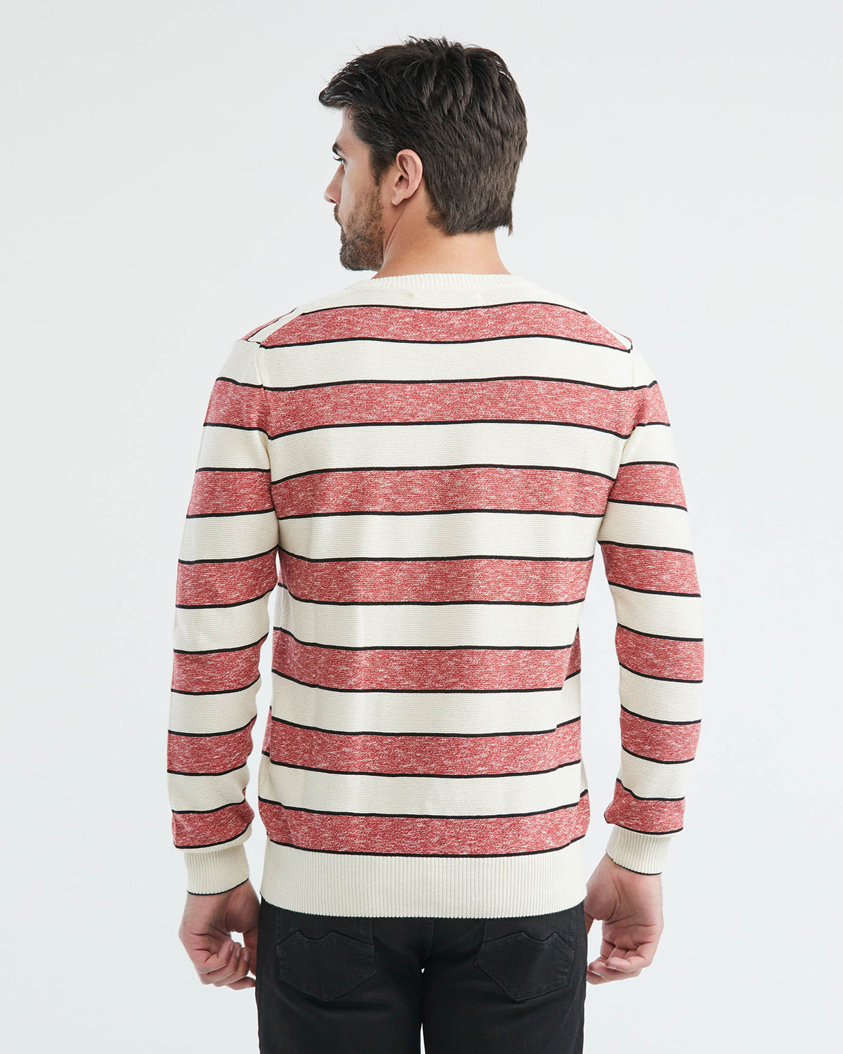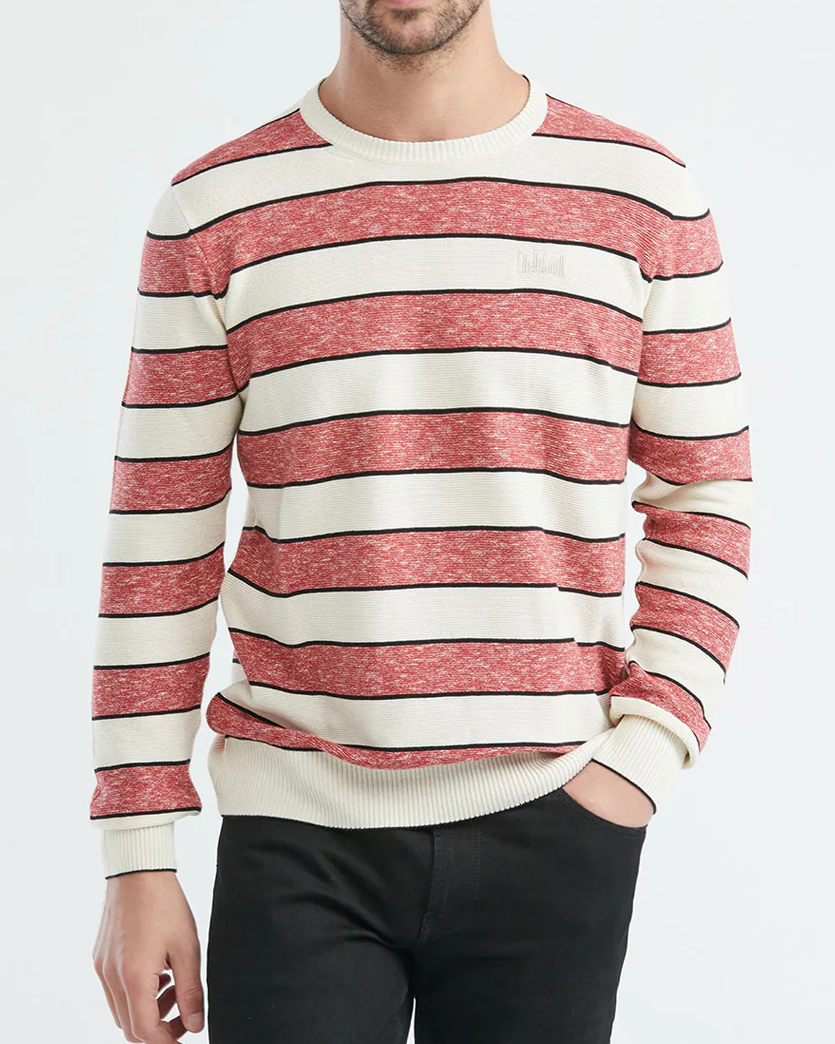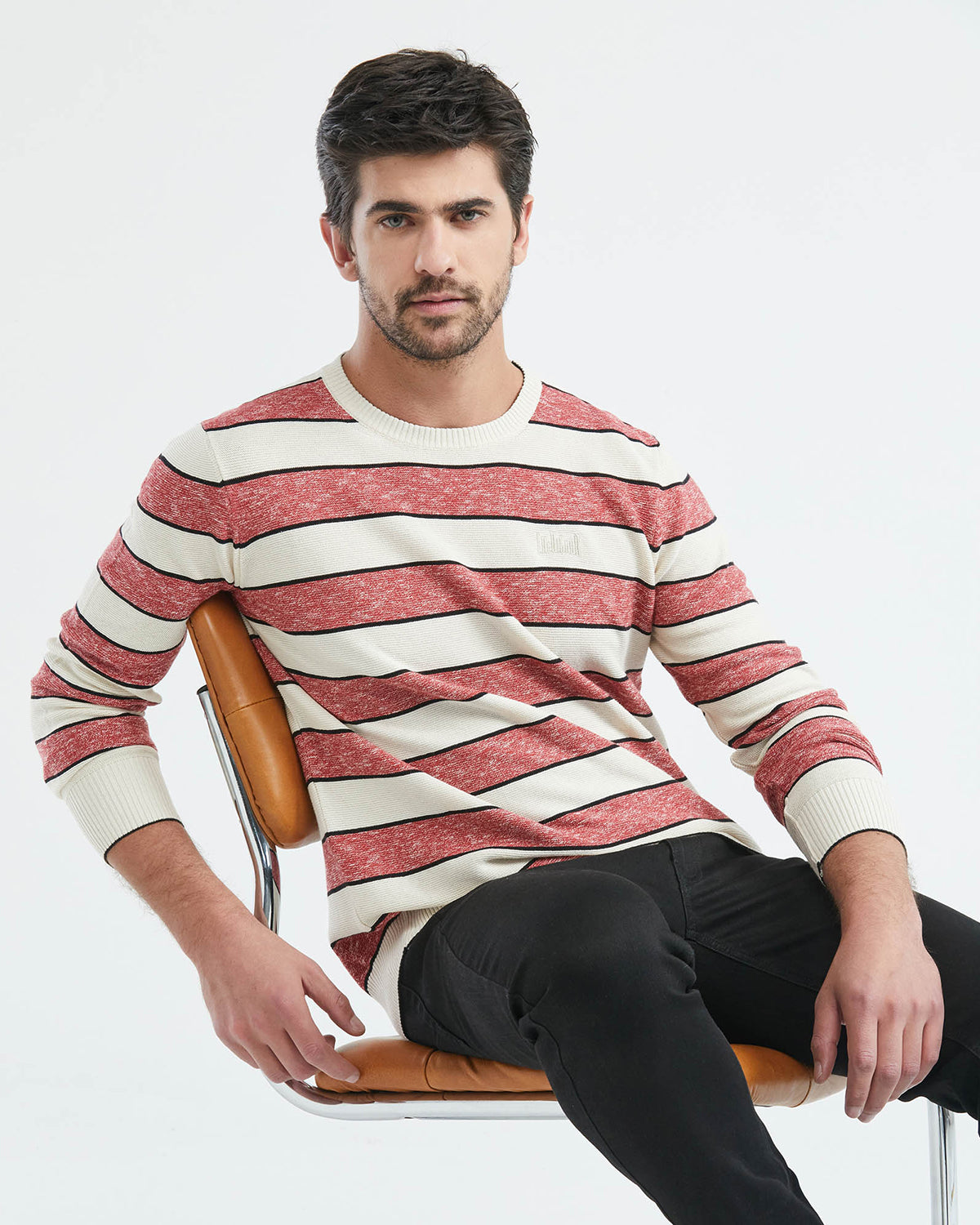 This striped knit sweater blends classic style with cozy comfort, featuring a soft fabric with varied textures for a dynamic look.