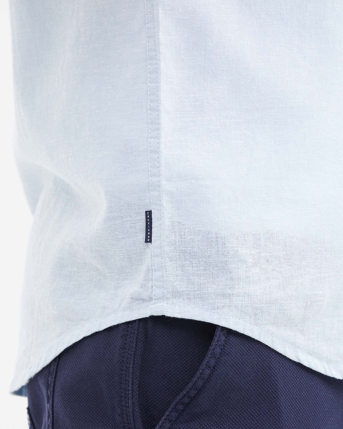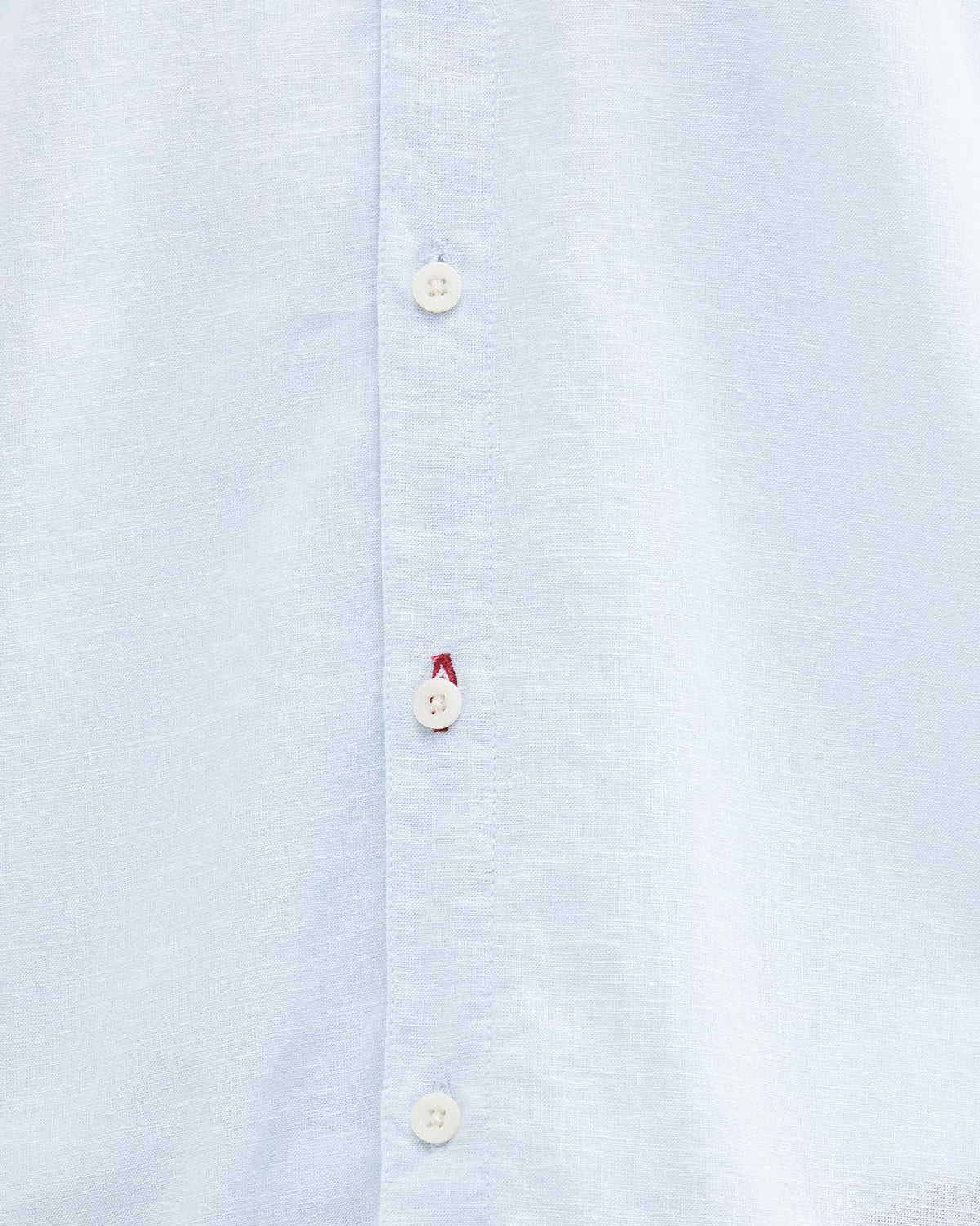 Classic-fit short-sleeve shirt in a soft light blue tone, made from a breathable linen-cotton blend. Features a tonal embroidered duck on the chest, contrast branded buttons, and a woven side label. Lightweight and versatile for everyday summer wear.