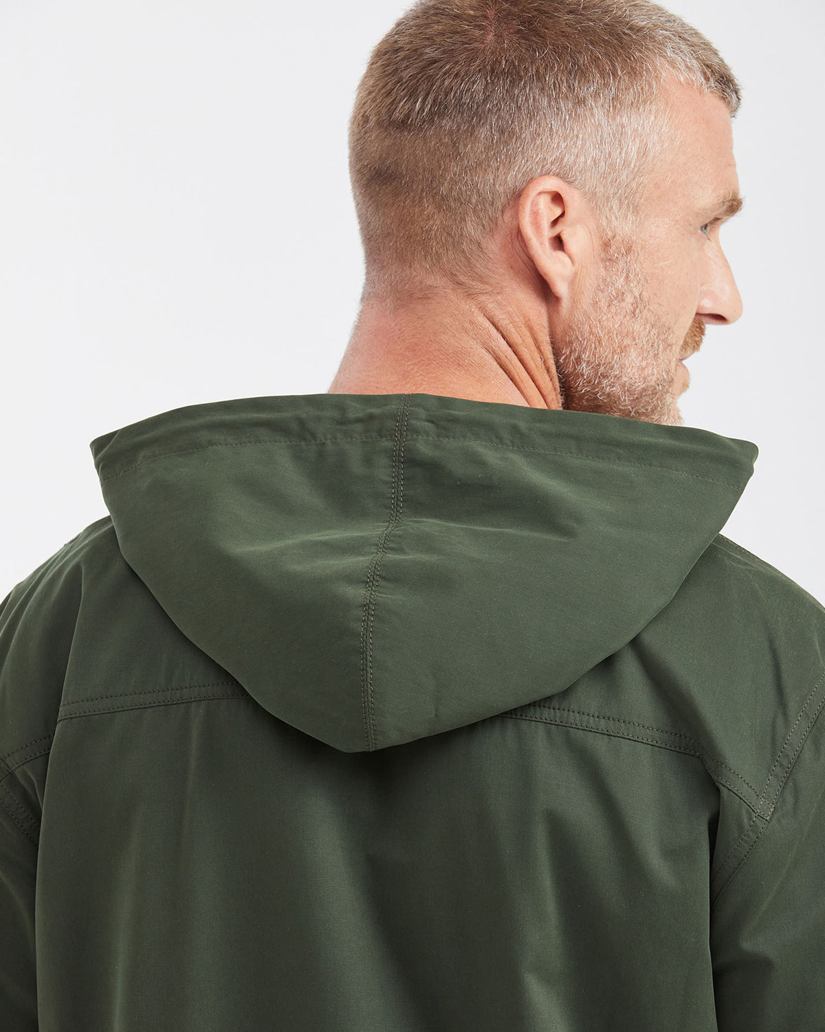 Windbreaker jacket in olive green with flap pockets on the chest and sides, adjustable hood with oversized drawcords and marked tips, and a front zip closure. Elastic cuffs and hem provide a snug fit, while a leather label on the side adds a discreet branded detail.