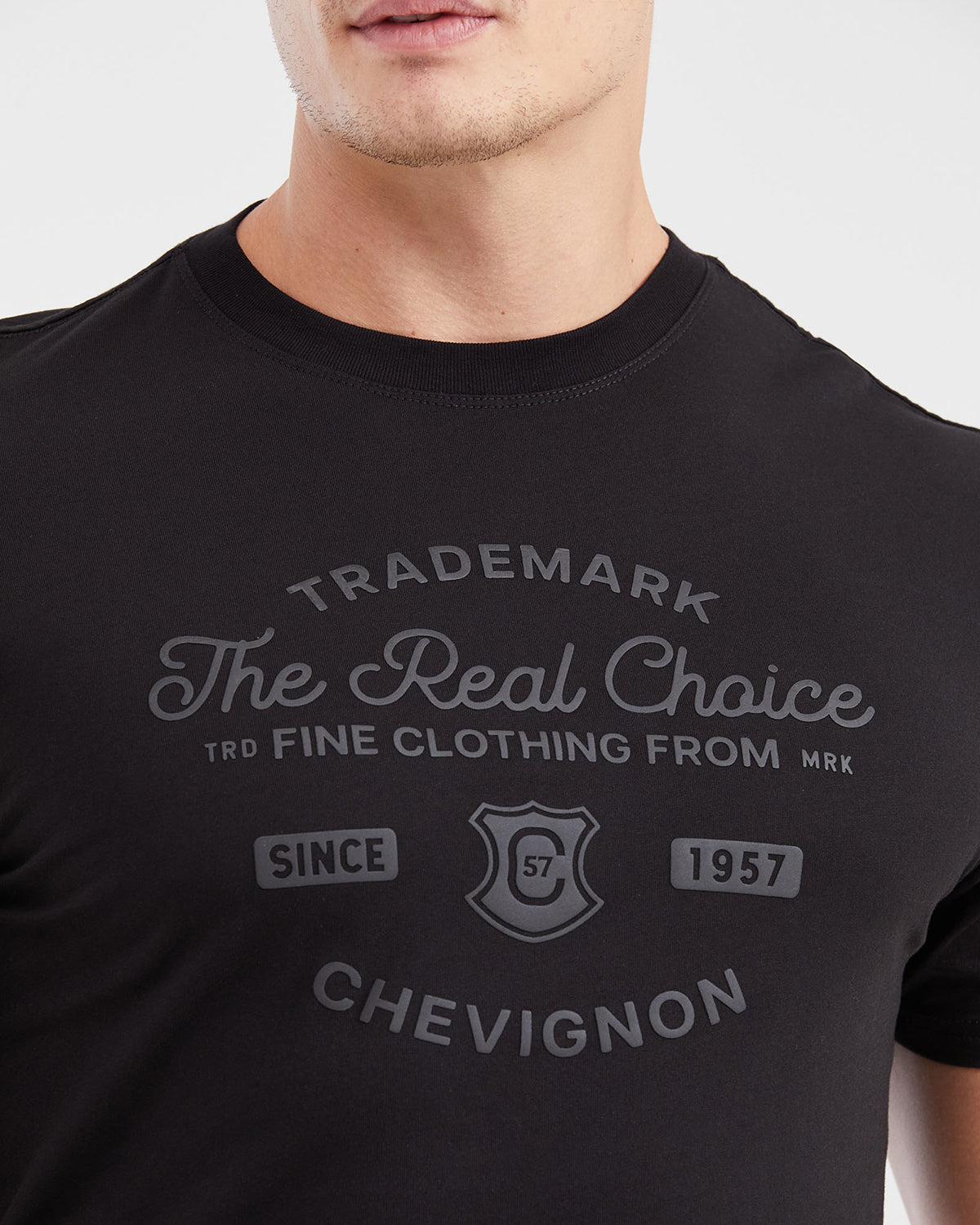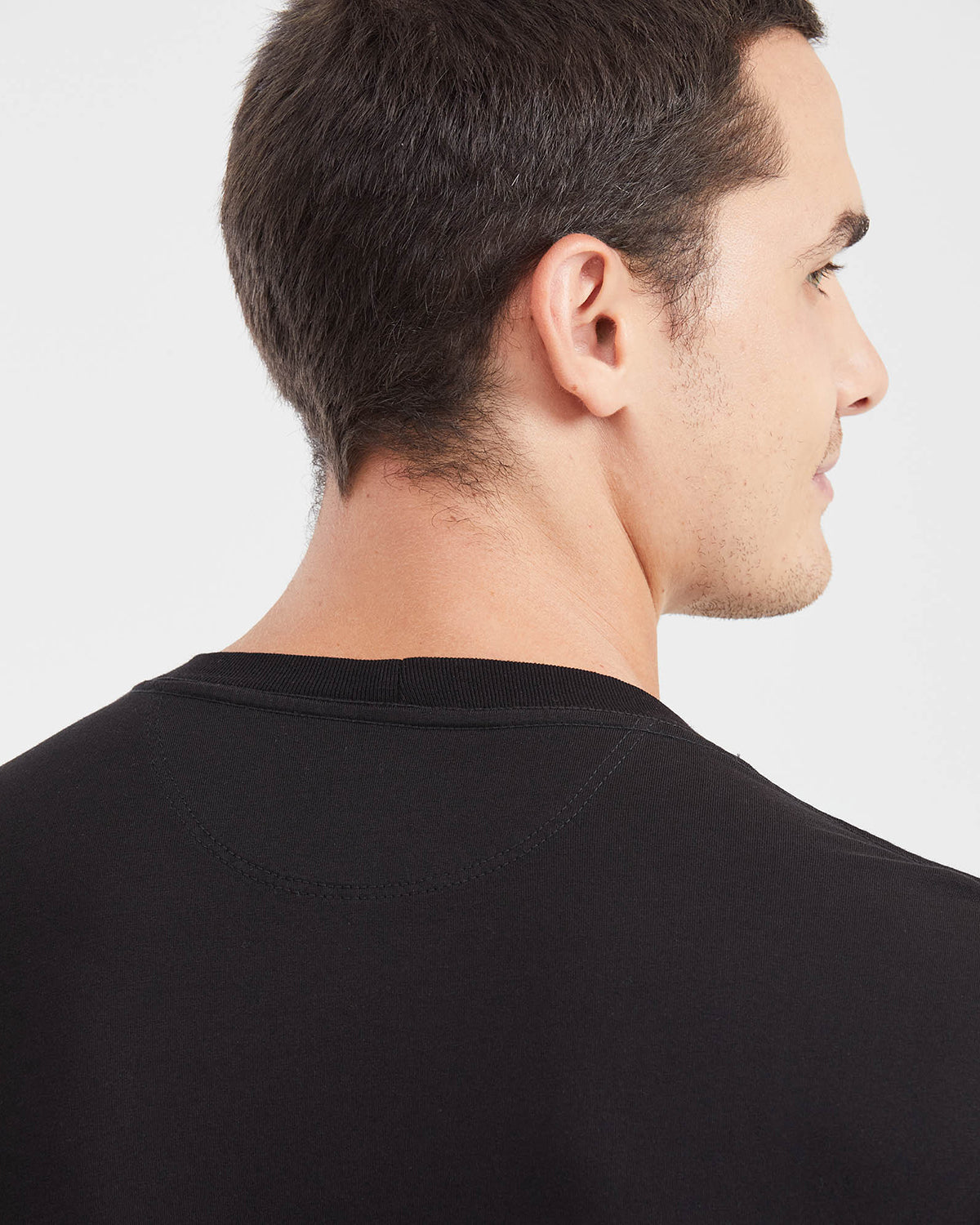Slim fit.Black.Tonal front print.Ribbed collar.Woven label.Short sleeves.Made in Colombia.
