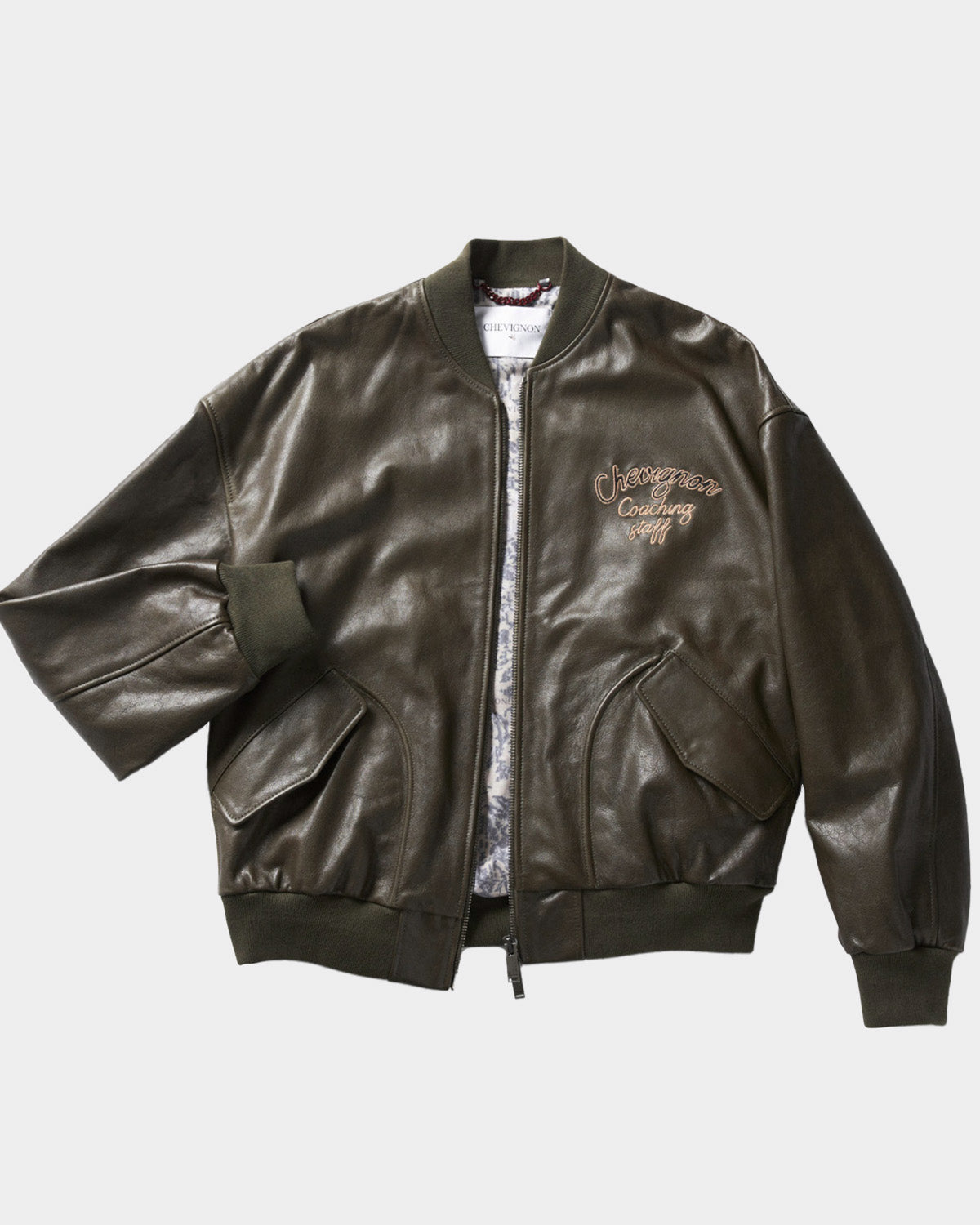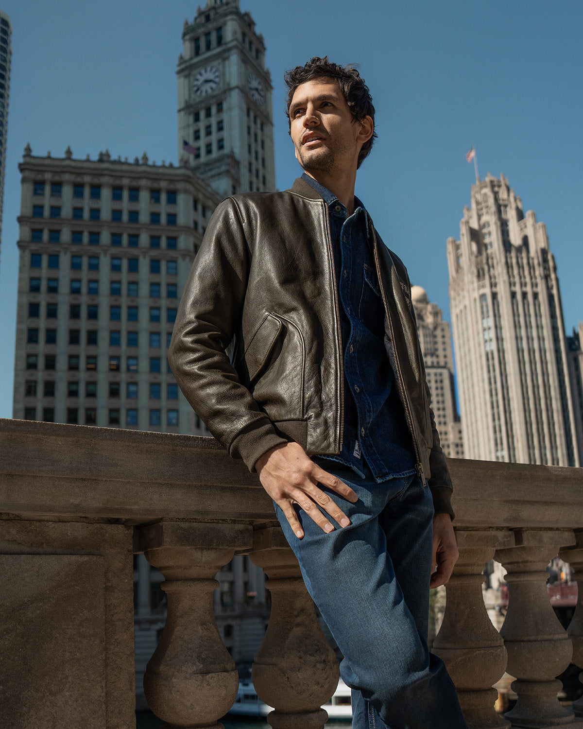 With it's aviator-inspired look, it is a nod to one of our very first jackets. This stunning green cowhide jacket features ribbed edges at the bottom and sleeves, and pockets secured by pressed studs. The teddy collar gives it a polished look as does its printed inner lining. This jacket has all the makings of an instant modern-day classic.