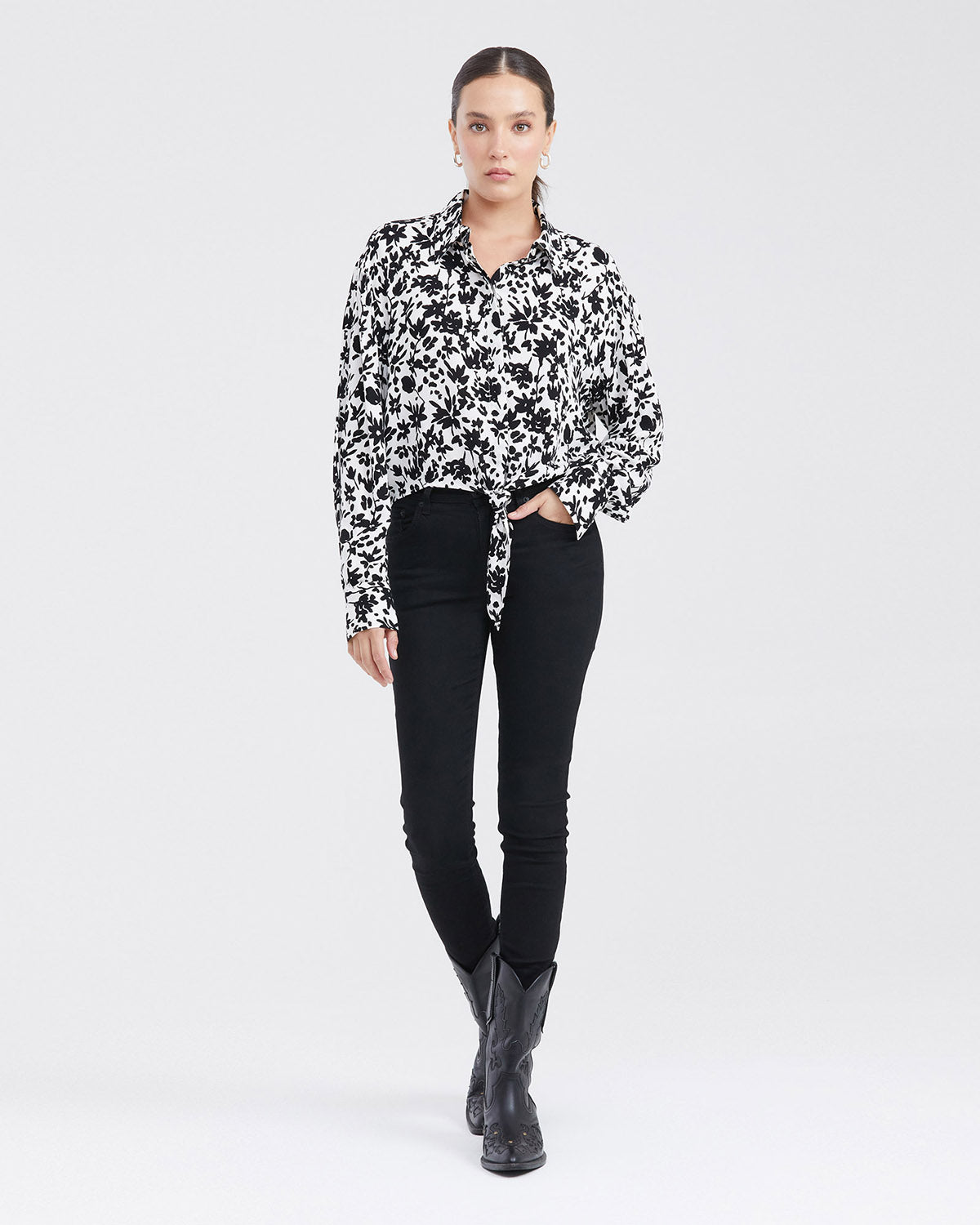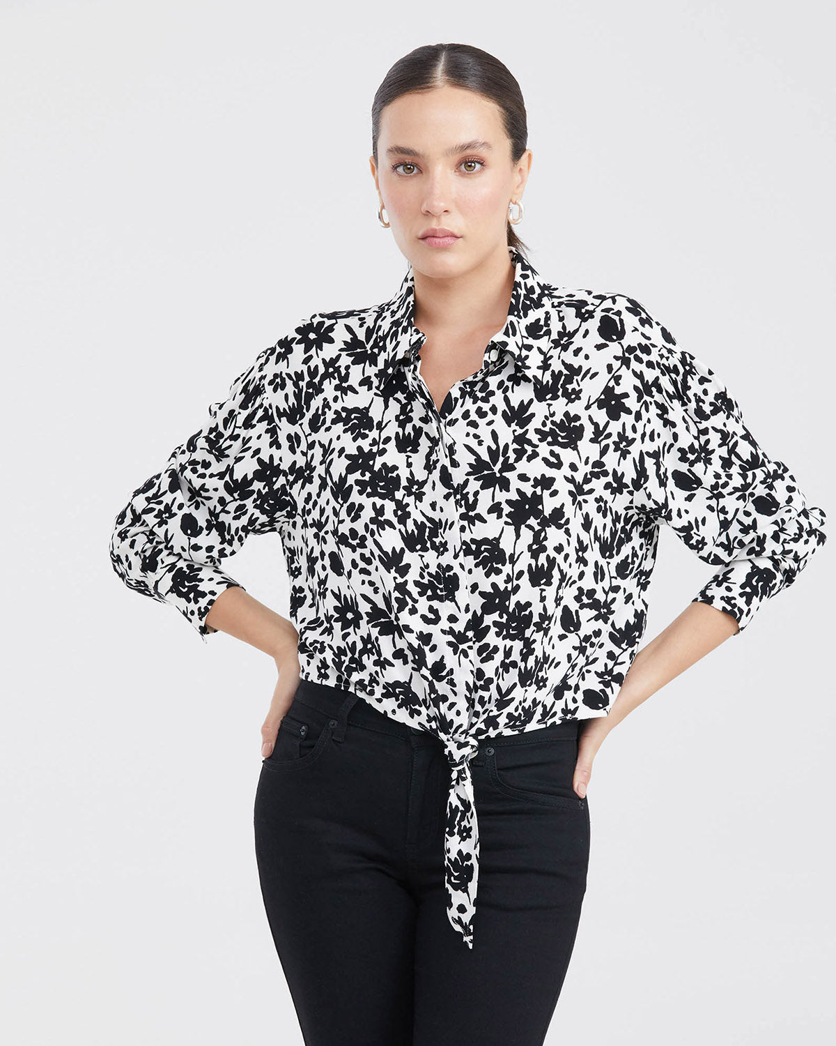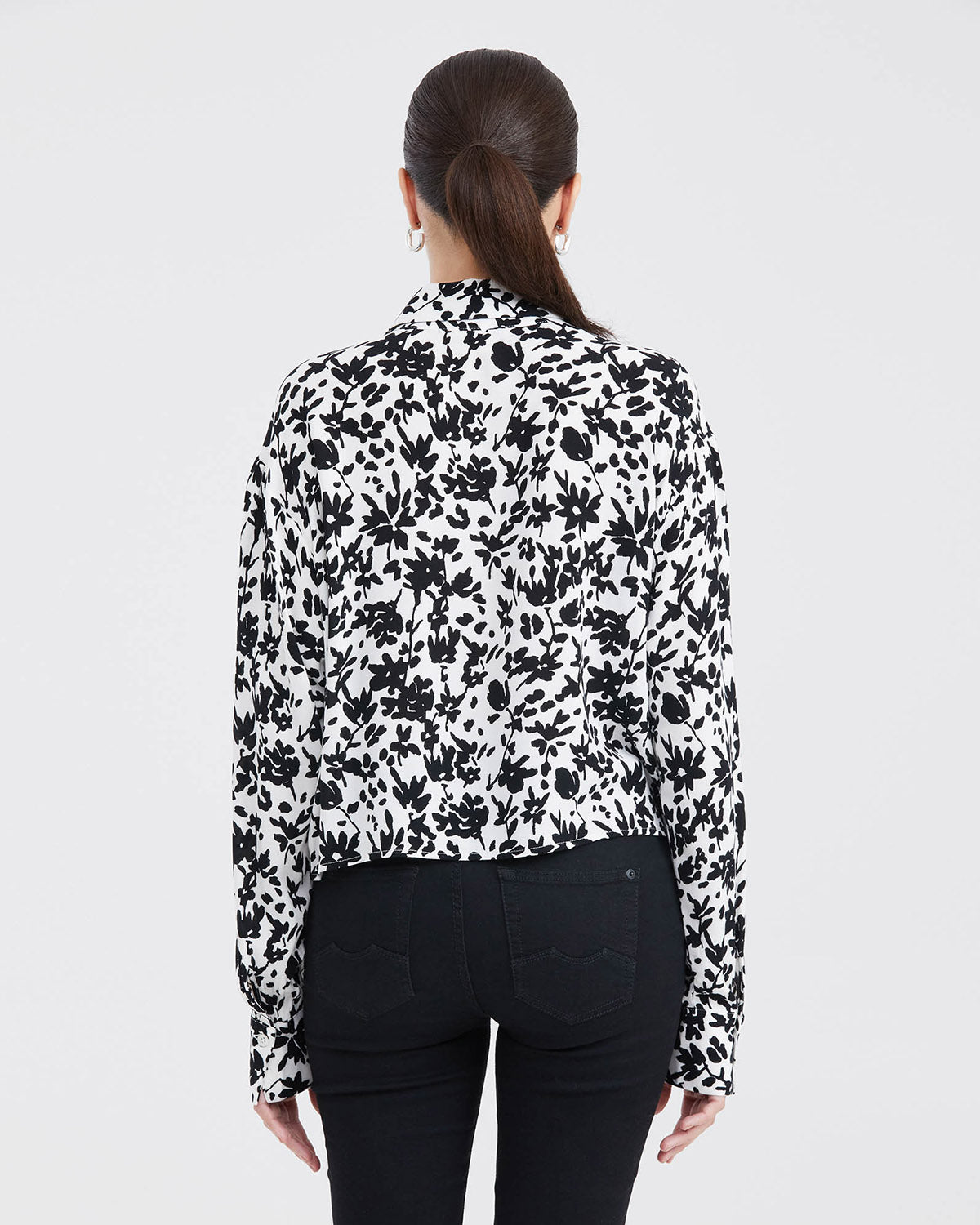 SHIRT WITH COLLAR, STRAIGHT SILHOUETTE, CROP LENGTH. HIDDEN BUTTON PLACKET, FRONT KNOT. LONG SLEEVES WITH BUTTONED CUFFS AND PLAIN BACK. FABRIC MADE FROM 100% RAYON FLAT WEAVE WITH A CREPE TEXTURE, SOFT TO THE TOUCH AND WITH GOOD DRAPE.