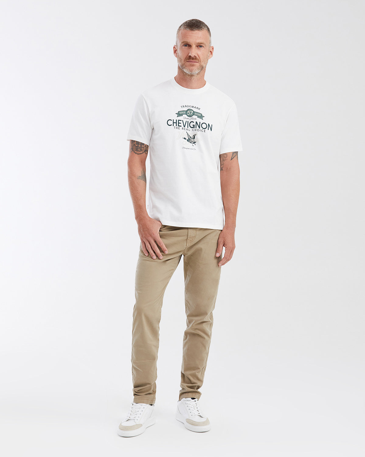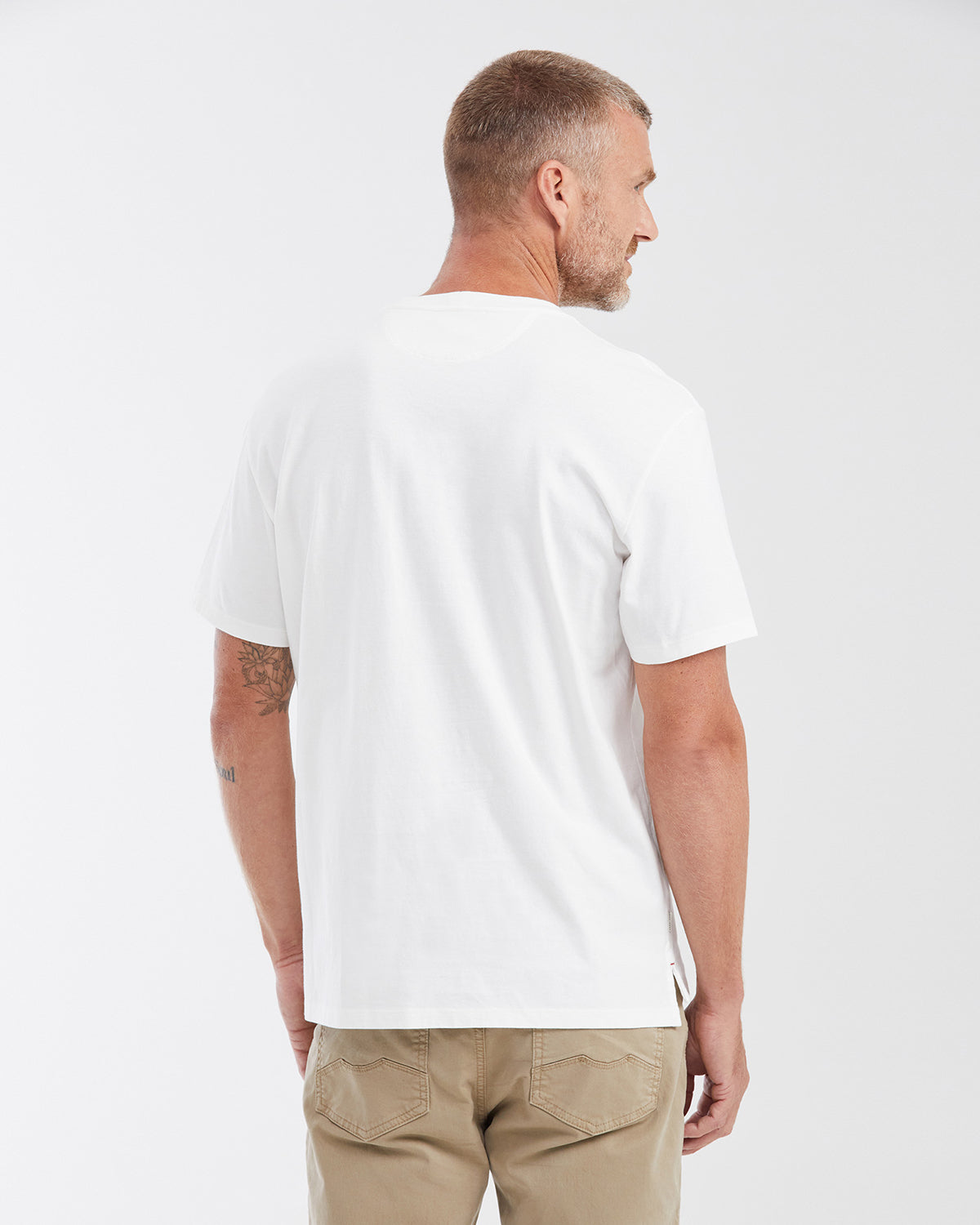 Classic fit.White.Front graphic.Ribbed collar.Red side slit details.Woven label.Short sleeves.Made in Colombia.