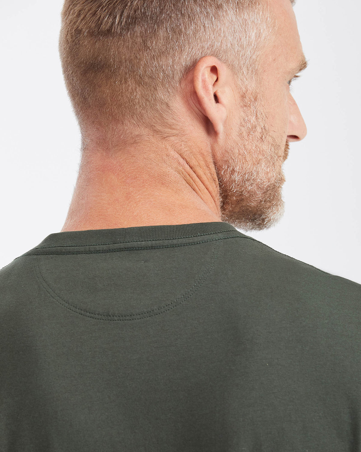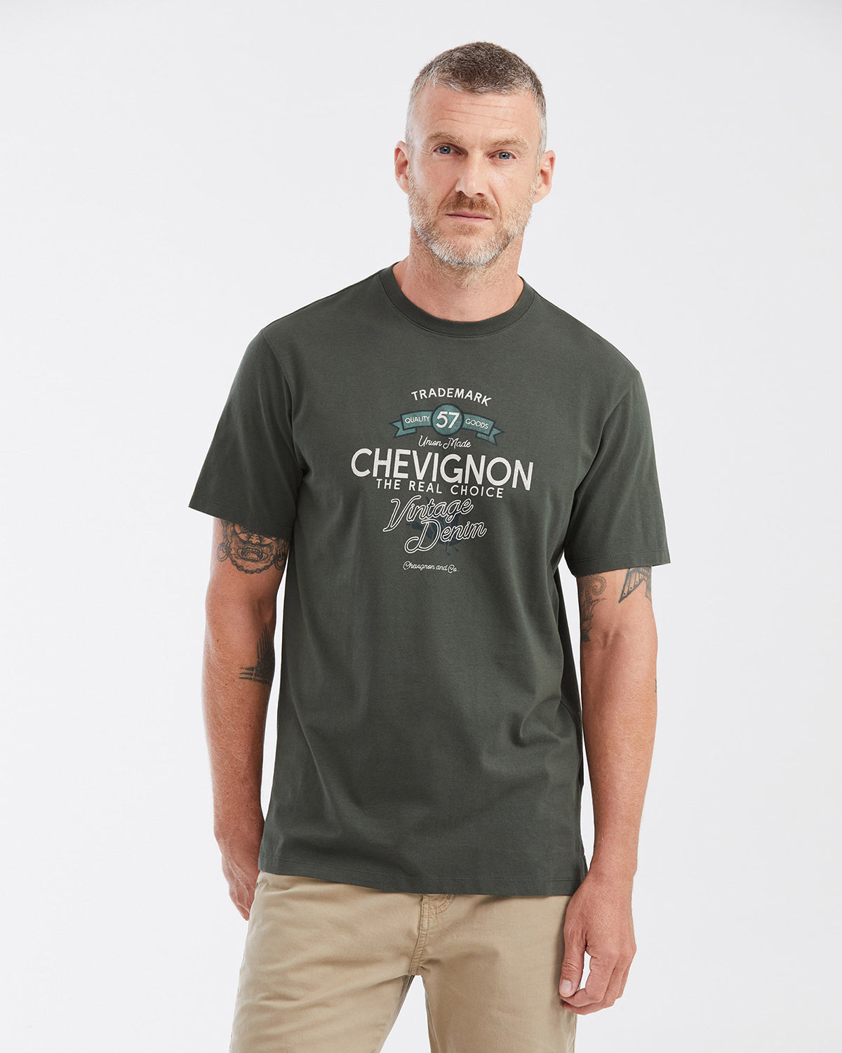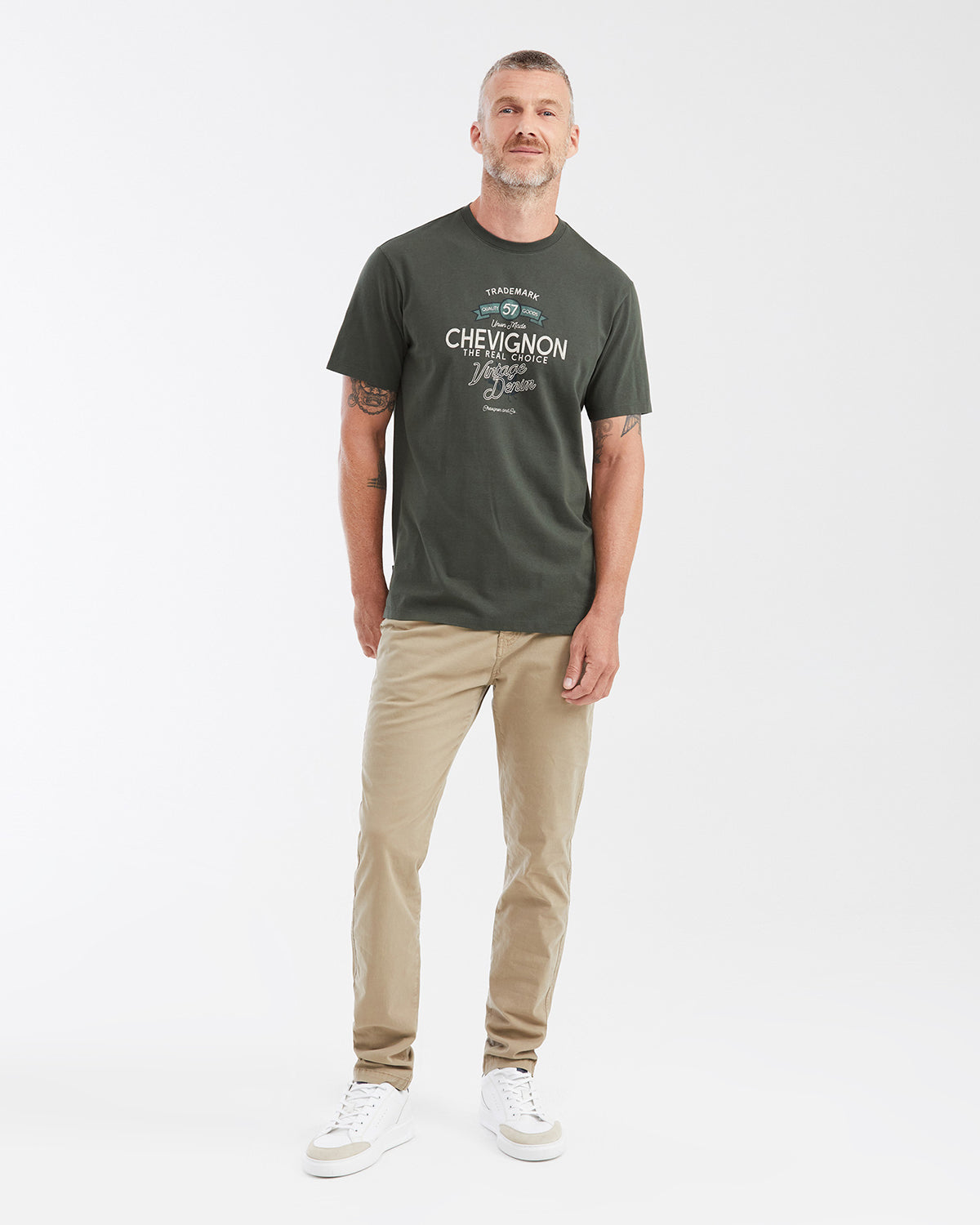 Classic fit.Olive green.Front graphic.Ribbed collar.Red side slit details.Woven label.Short sleeves.Made in Colombia.