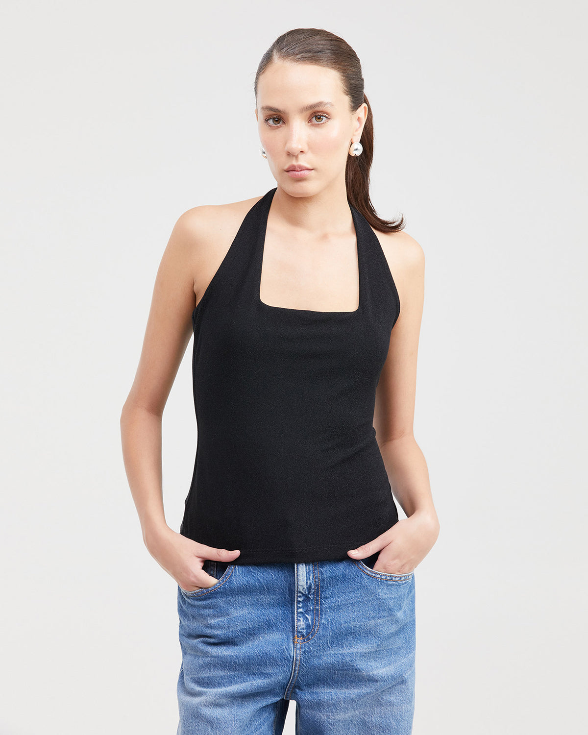This black halter top is a wardrobe essential for elevated nights out. Featuring a square neckline and clean-finish silhouette, it's fully lined with soft mesh for added comfort. Made from a stretch knit with lurex, it offers a subtle shimmer and a flattering fit.