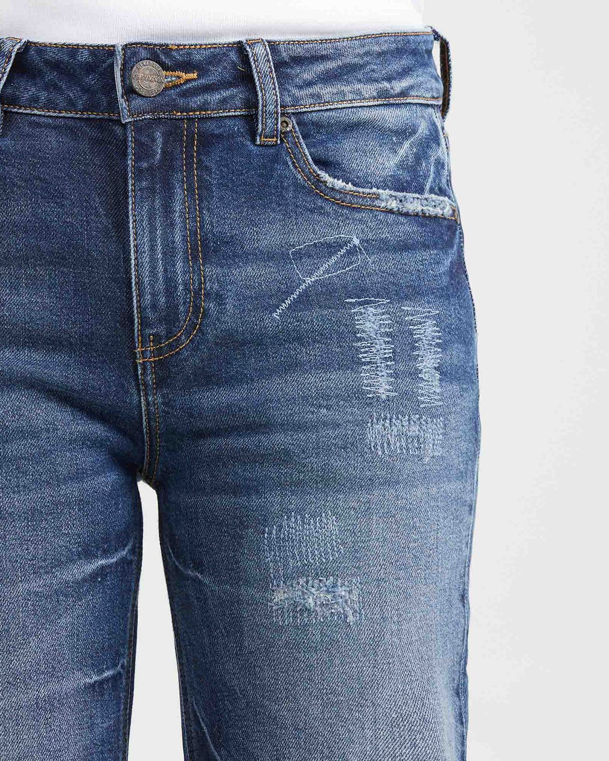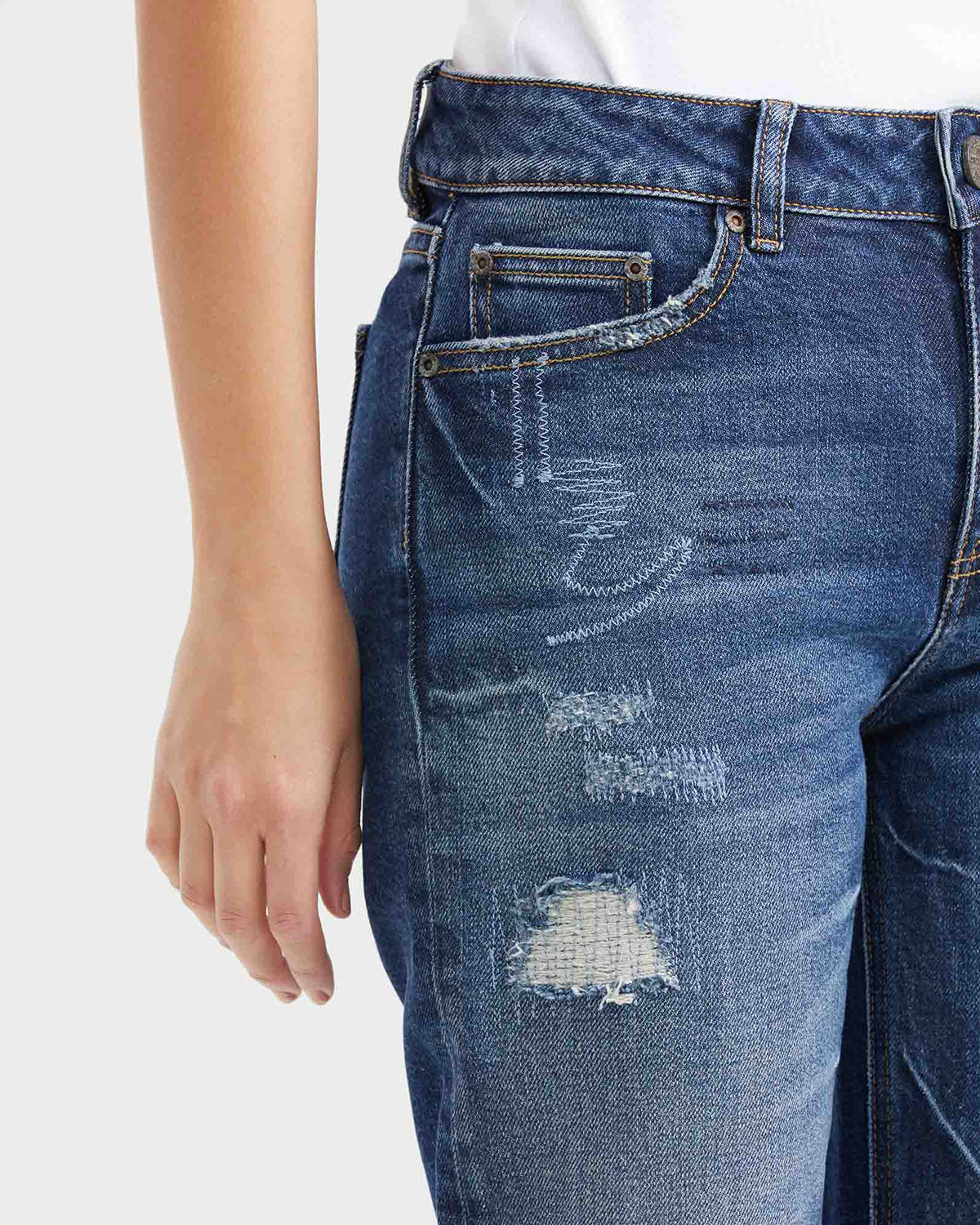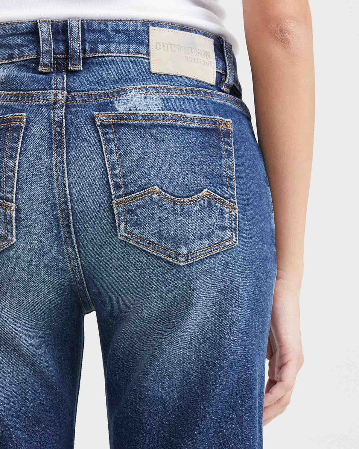 Cosmo jeans / high rise: It has two front pockets and a watch pocket on the right side. It has two patch pockets on the back. A leather garra label on the waistband. It has a button on the waistband and 8 rivets.