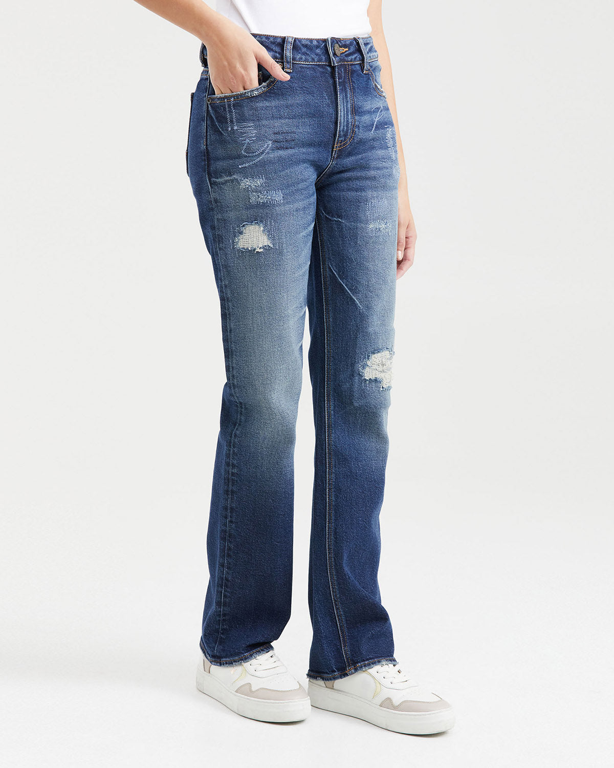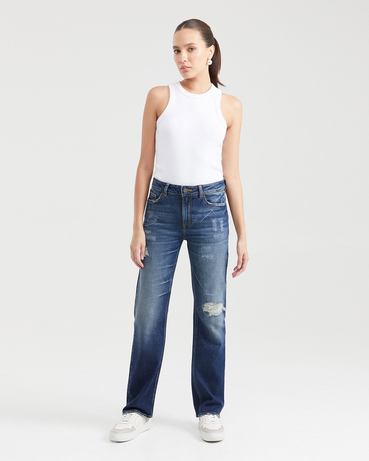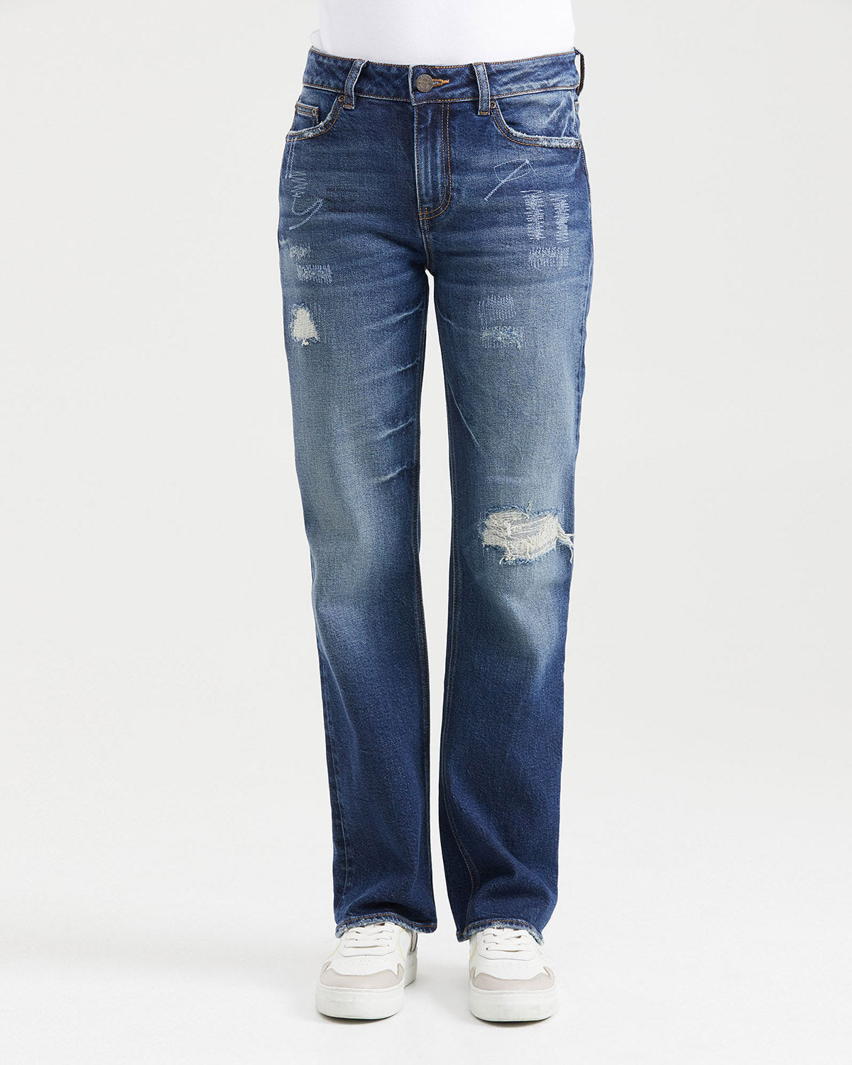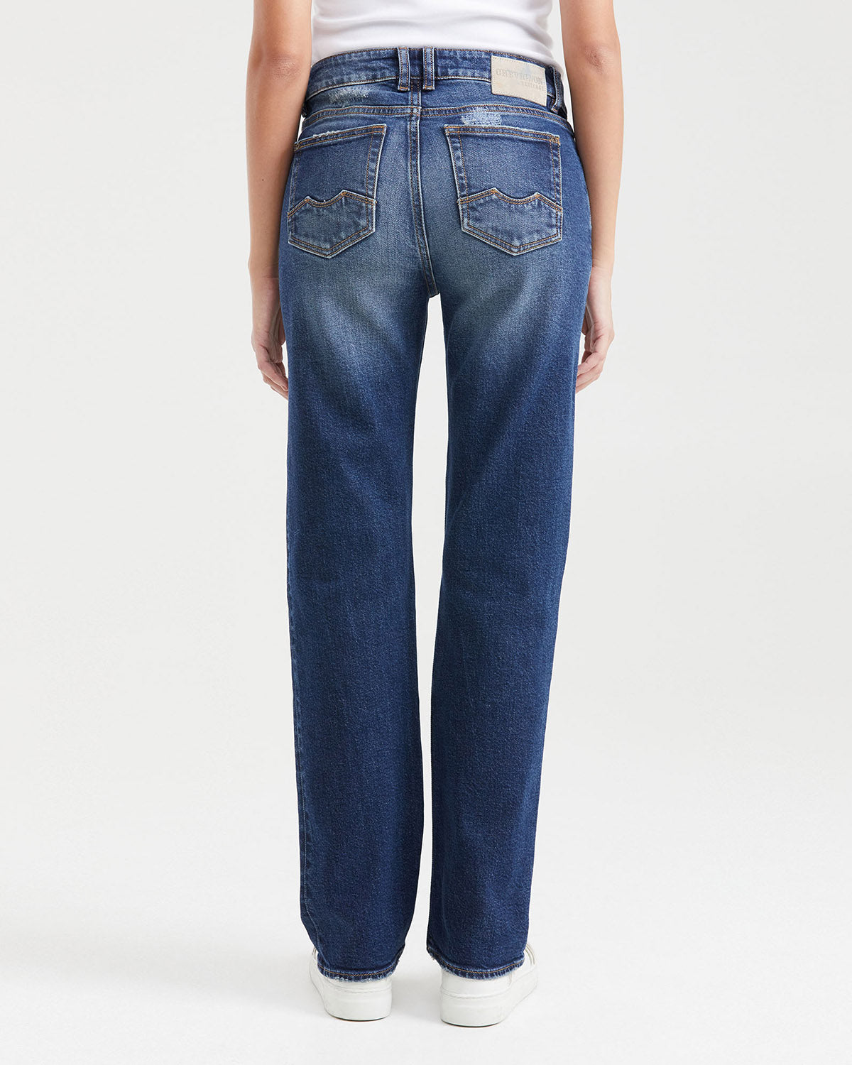 Cosmo jeans / high rise: It has two front pockets and a watch pocket on the right side. It has two patch pockets on the back. A leather garra label on the waistband. It has a button on the waistband and 8 rivets.