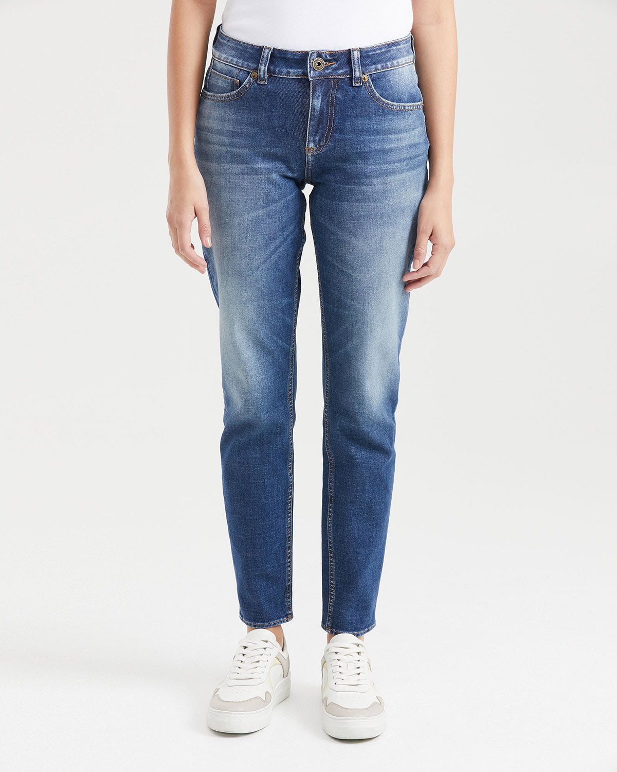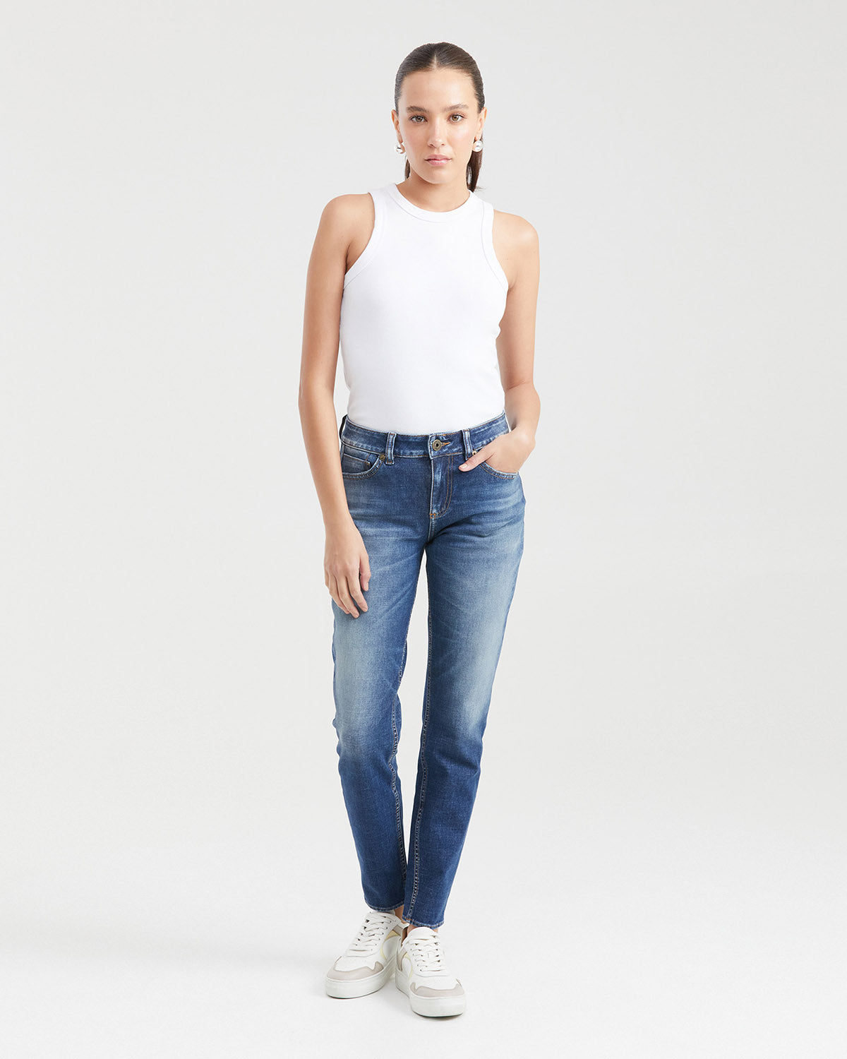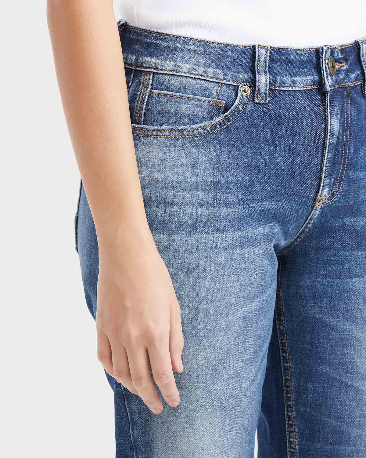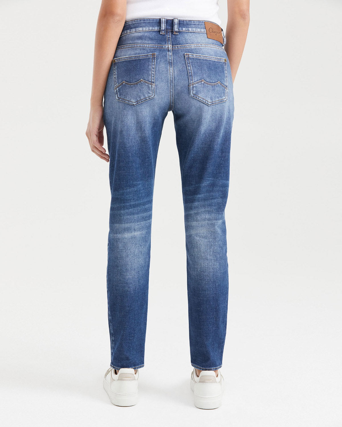 Rusty jeans / low rise: It has two front pockets and a watch pocket on the right side. It has two patch pockets on the back. A leather garra label on the waistband. It has a button on the waistband and 6 rivets.