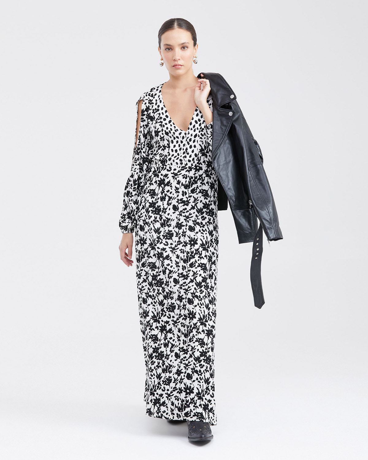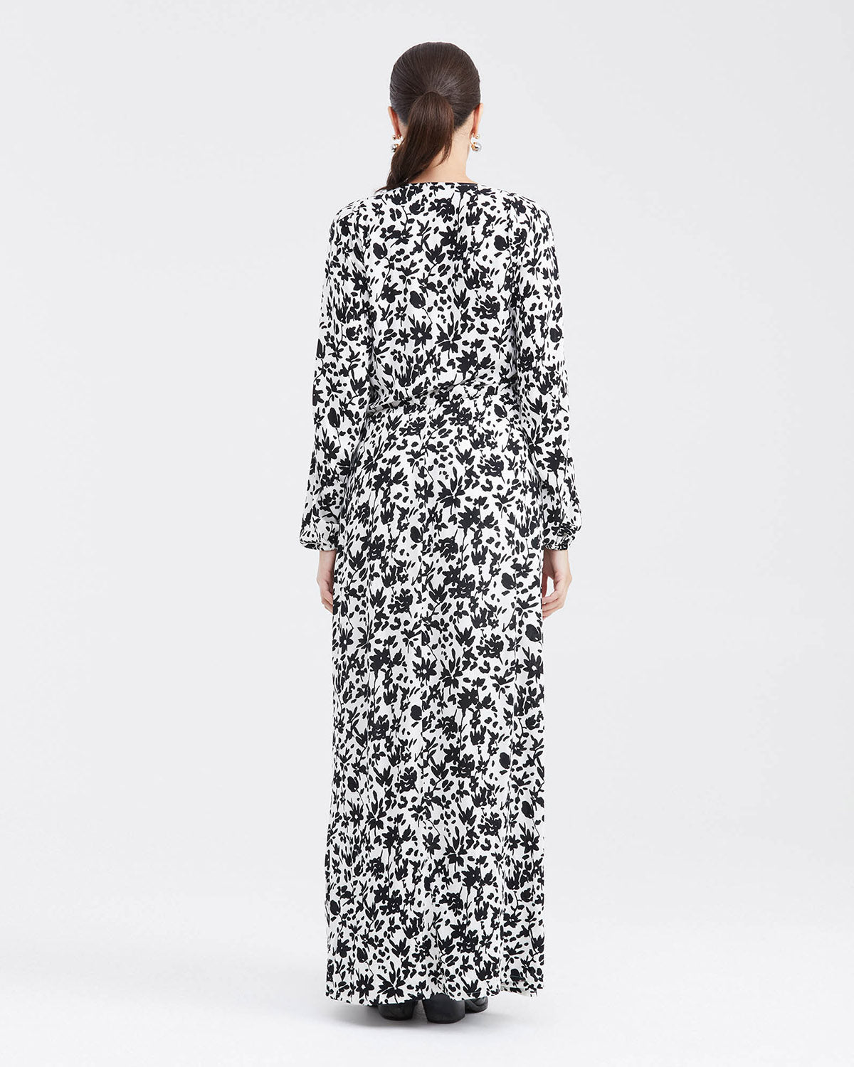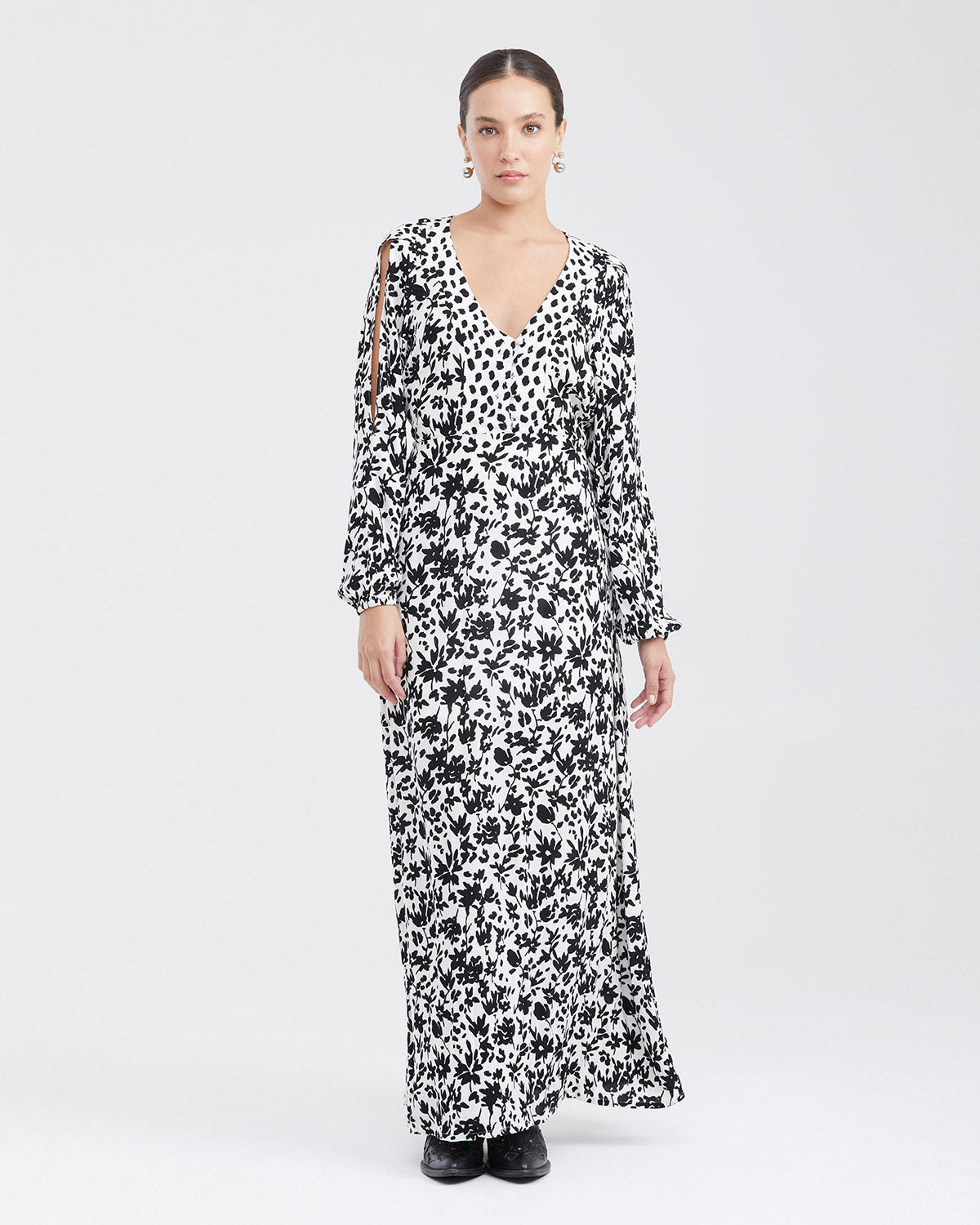 MAXI DRESS, V-NECK, LONG SLEEVES WITH ELASTIC CUFFS AND SIDE SLITS. RAGLAN ARMHOLES. DECORATIVE BUTTON PLACKET AND LONG FLARED SKIRT. FULLY LINED. PLAIN WOVEN FABRIC WITH CONTINUOUS FLORAL PRINT, 100% RAYON WITH CREPE TEXTURE, SOFT TOUCH AND GOOD DRAPE.