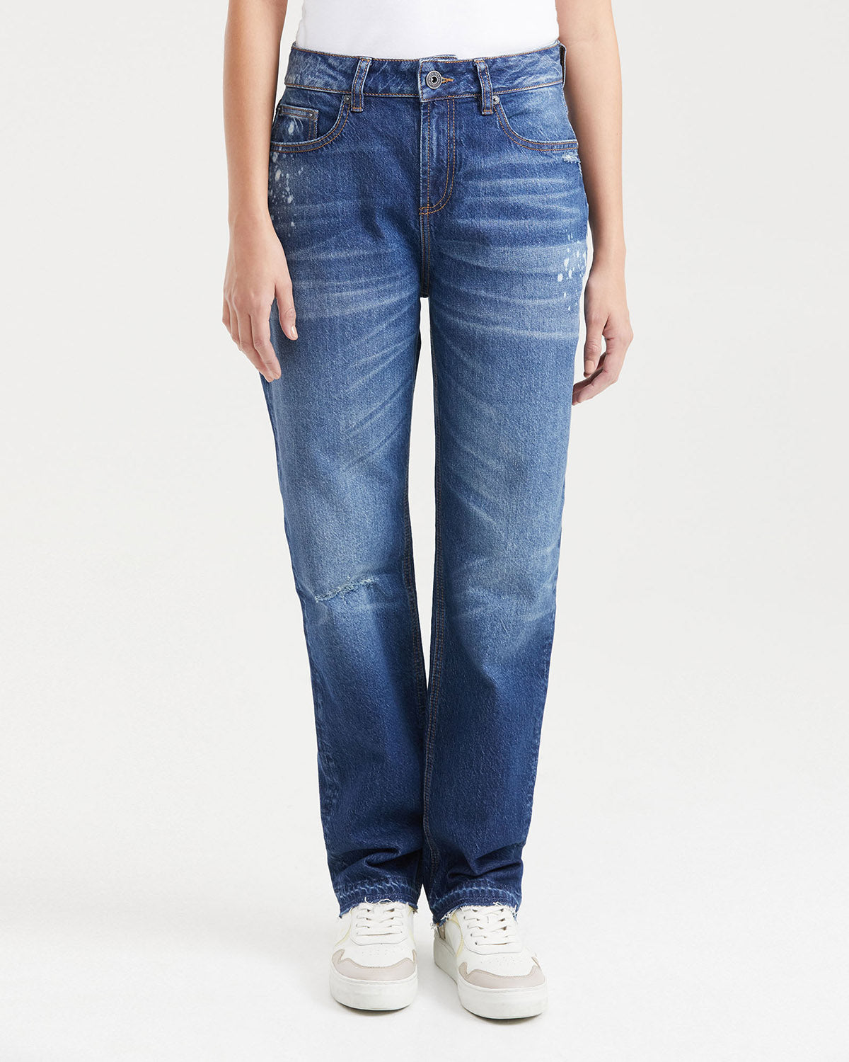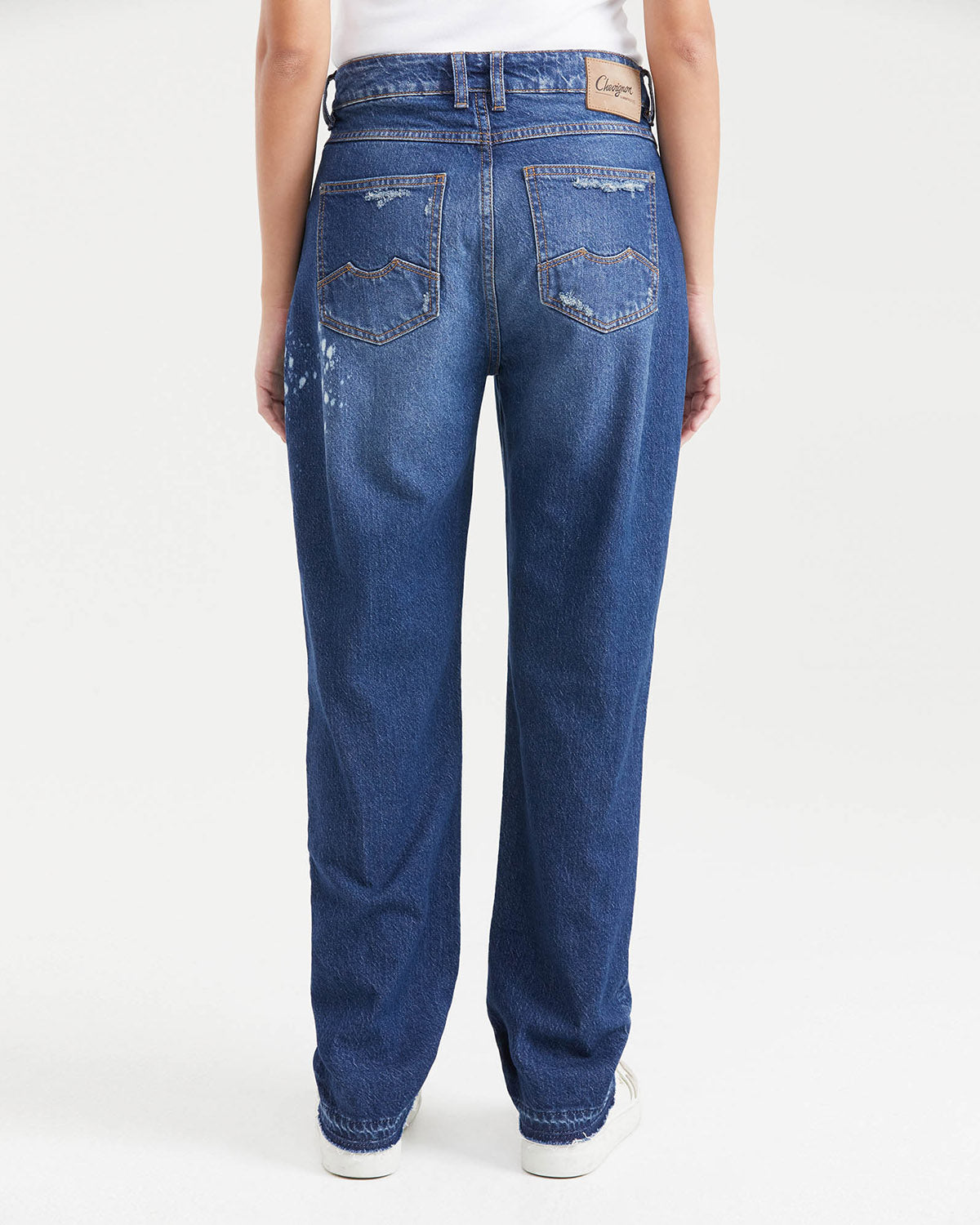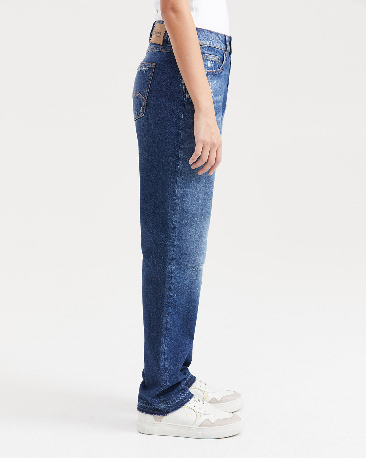 Boy fit jeans: It has two front pockets and a watch pocket on the right side. It has two patch pockets on the back. A leather garra label on the waistband. It has a button on the waistband and 8 rivets.