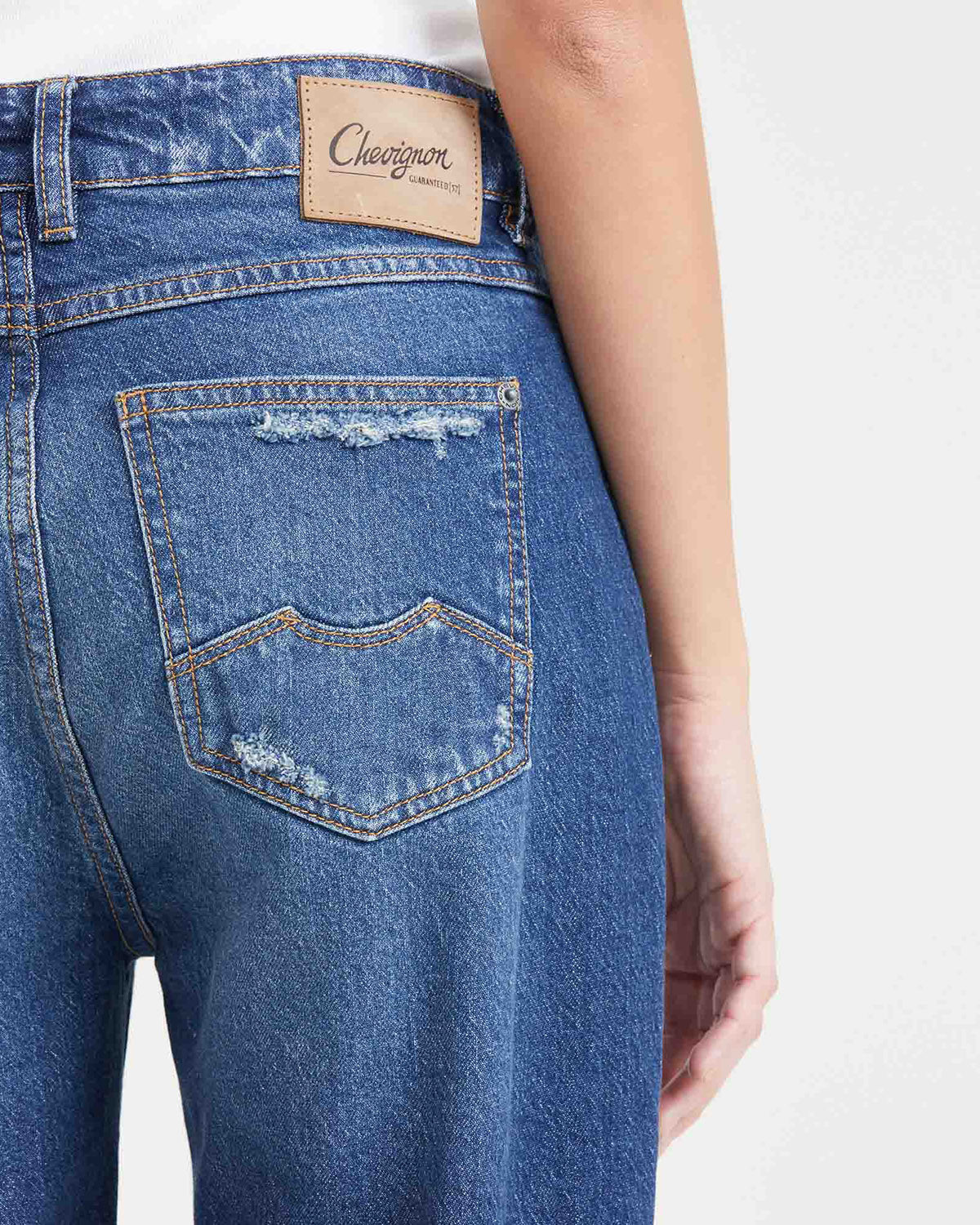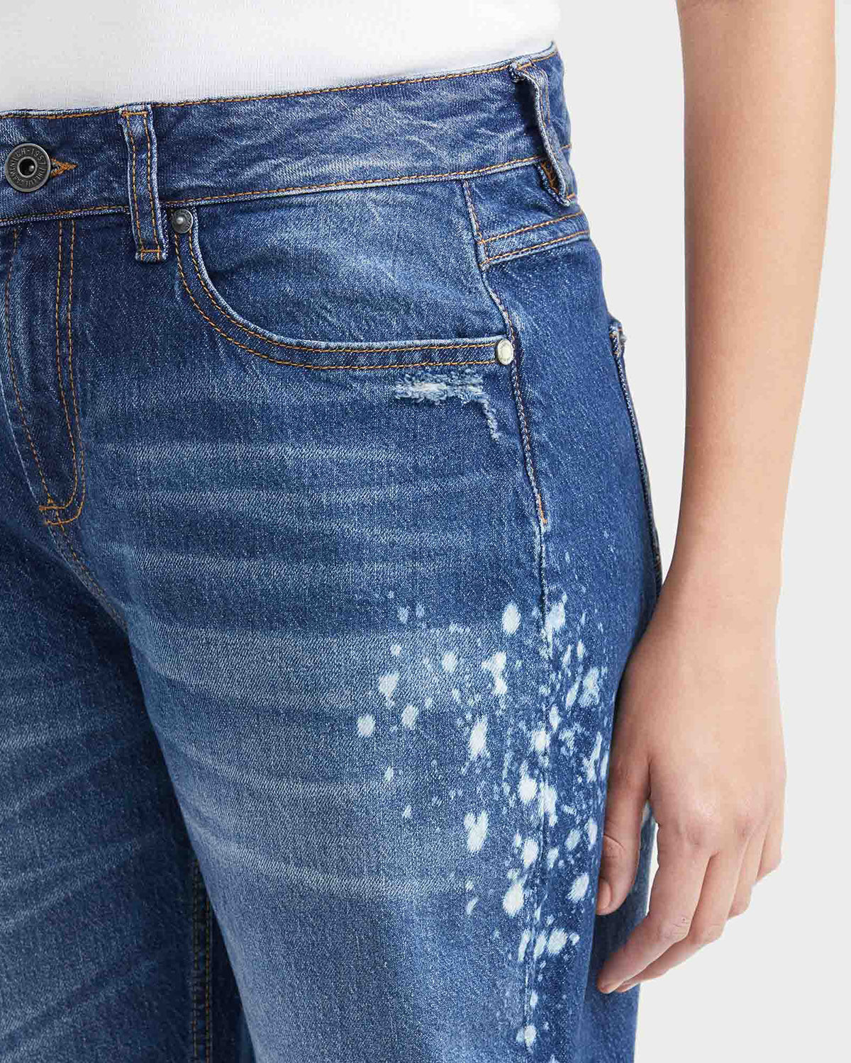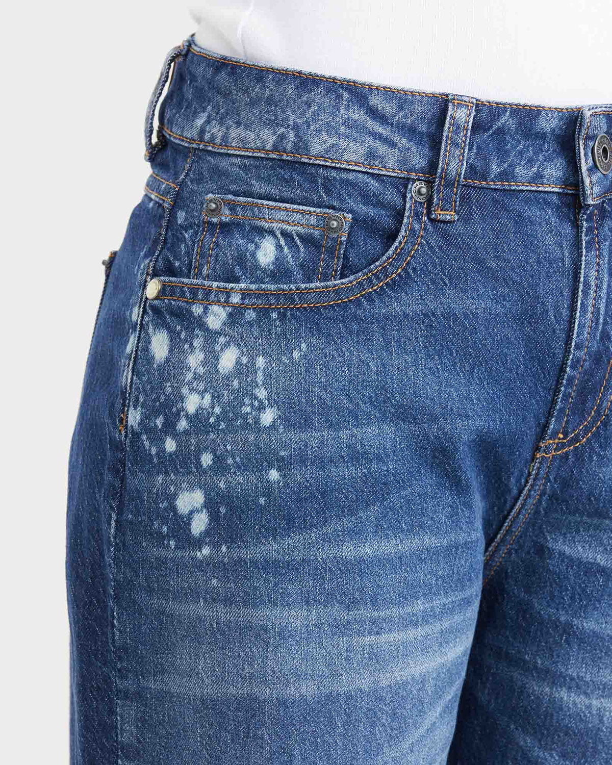 Boy fit jeans: It has two front pockets and a watch pocket on the right side. It has two patch pockets on the back. A leather garra label on the waistband. It has a button on the waistband and 8 rivets.
