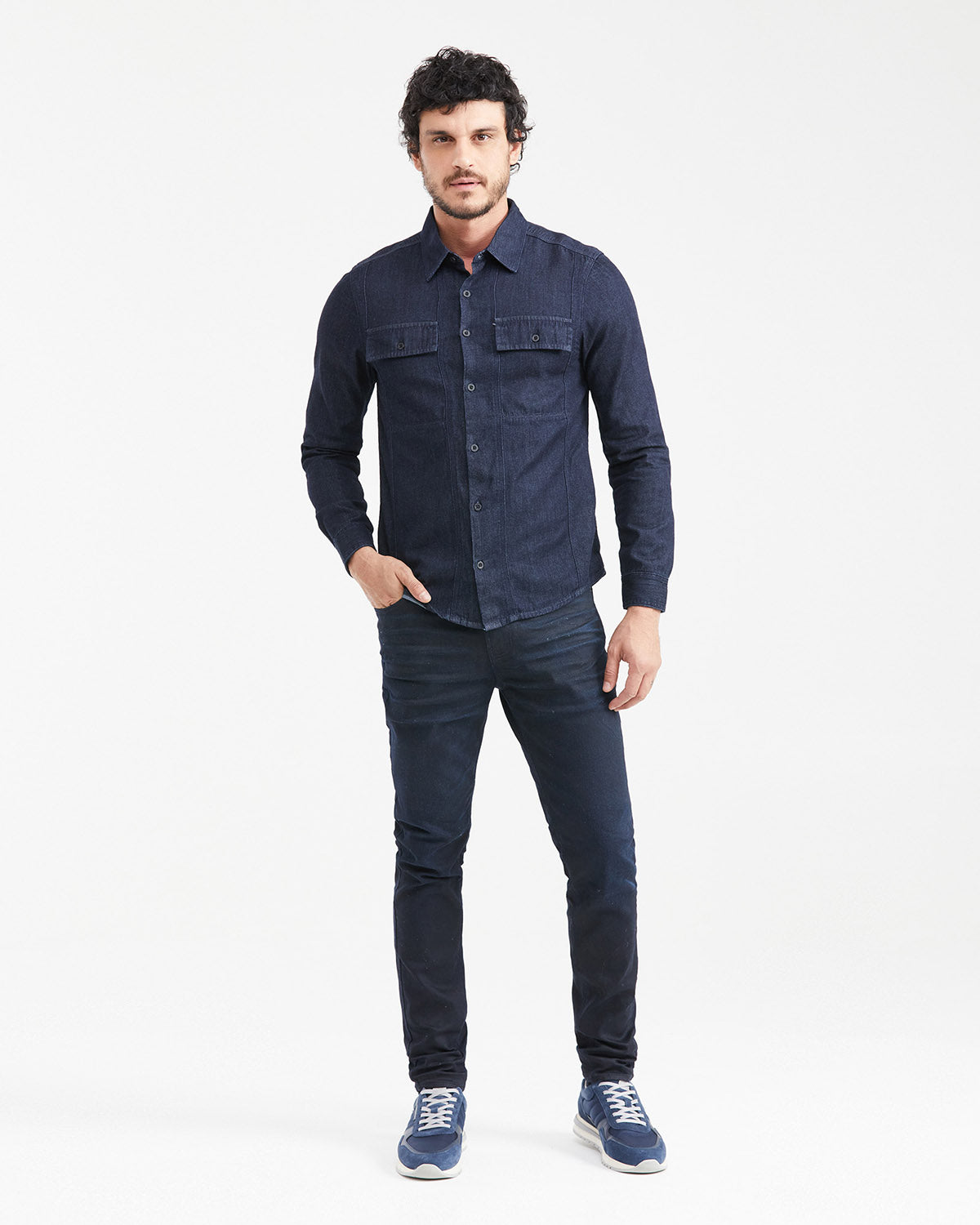 Refined yet effortlessly versatile, this men's navy long-sleeve shirt is a wardrobe essential that transitions seamlessly from day to night. Thoughtfully tailored in a slim-fit silhouette with a classic seven-button front, it strikes the perfect balance between relaxed ease and understated elegance. It features dual front pockets and a discreet woven label, adding a touch of heritage-inspired detail. Crafted in premium fabric, its soft, breathable feel ensures comfort while maintaining a polished look. Whether styled with crisp chinos or monochromatic pants for a smart finish or layered over a T-shirt for a laid-back vibe, this piece embodies contemporary sophistication with a timeless appeal.
