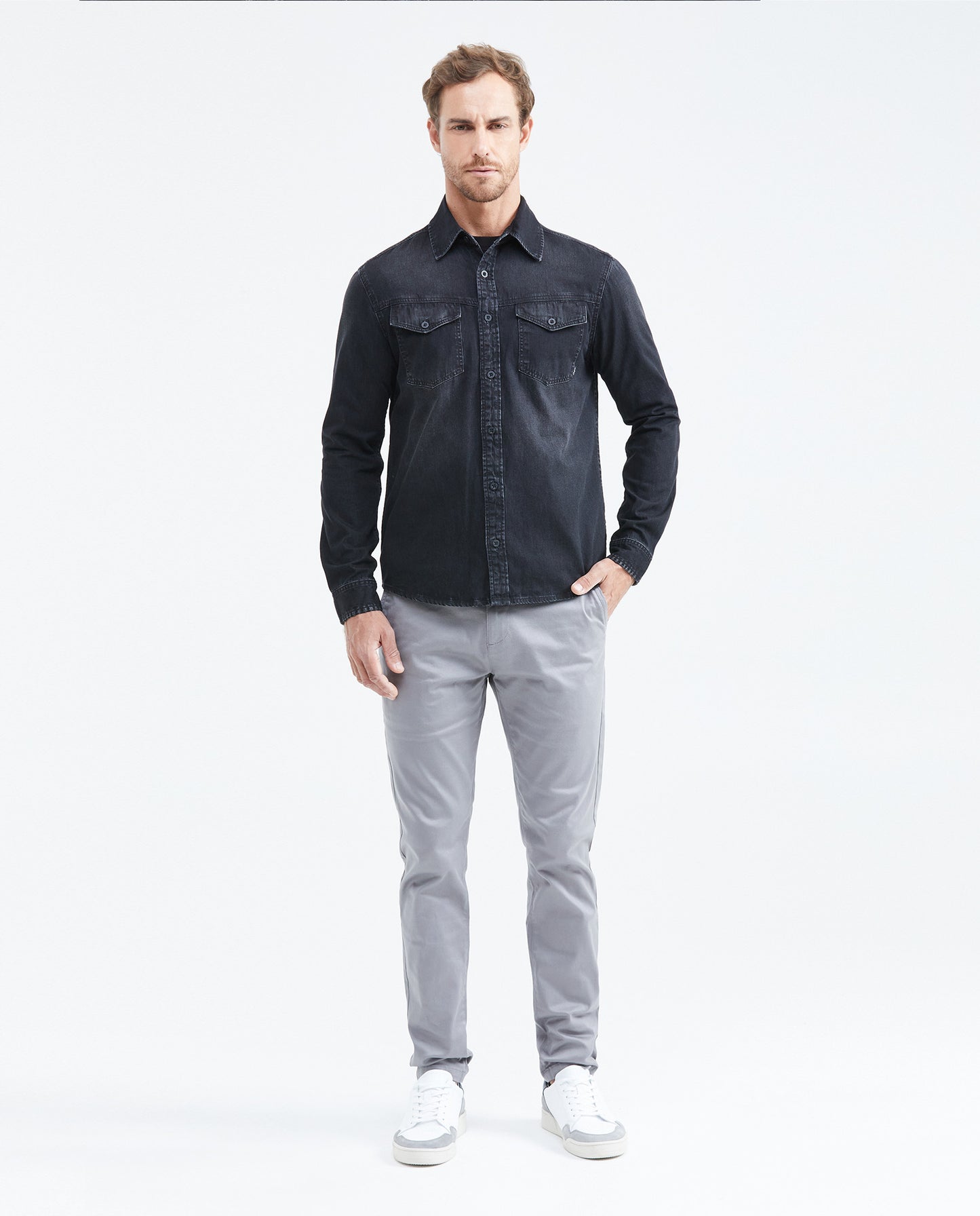 • Traditional waistband with button and loops, zipper, diagonal front pockets with decorative cut and piping on the edge, back welt pockets with double flap and button, and straight leg.