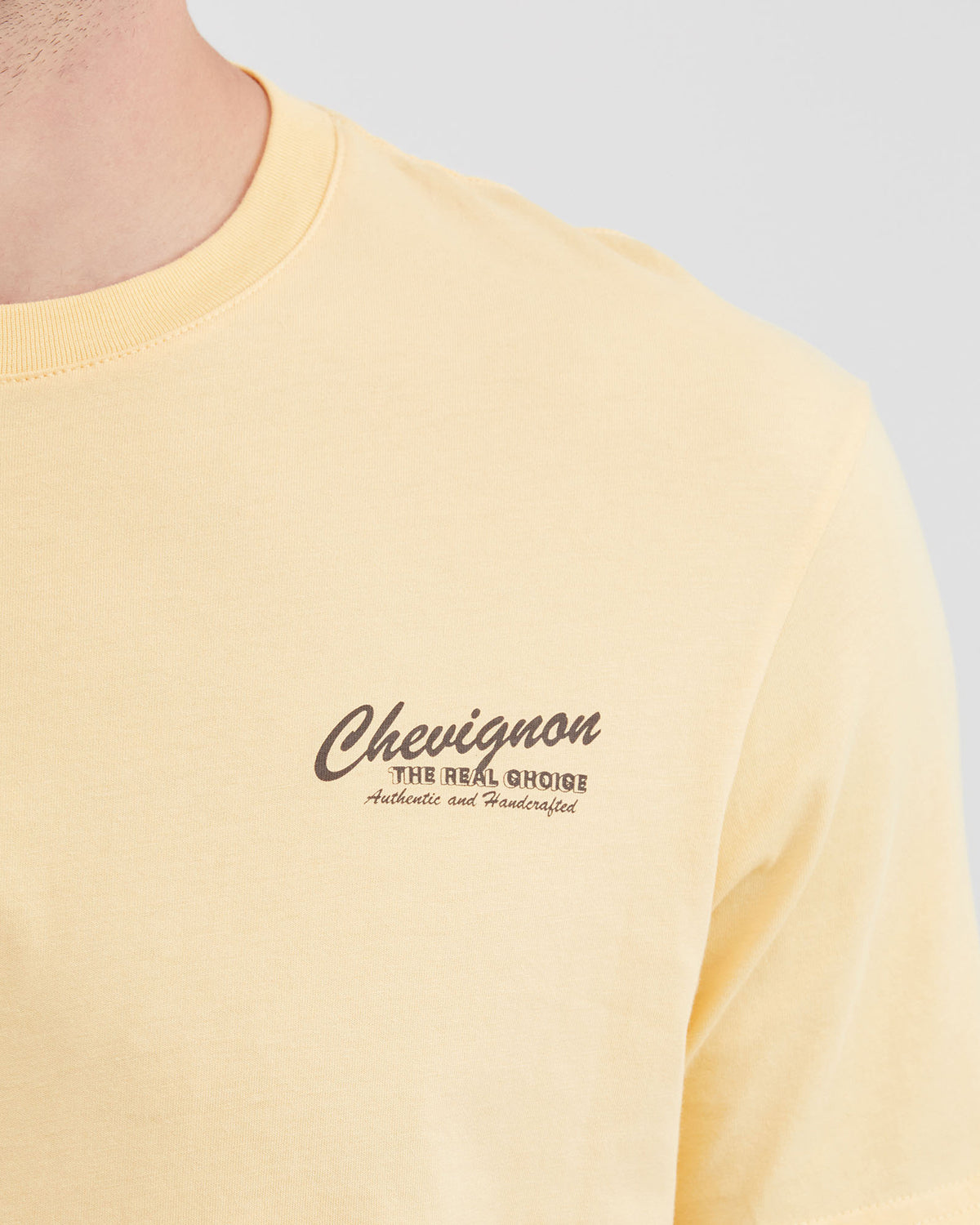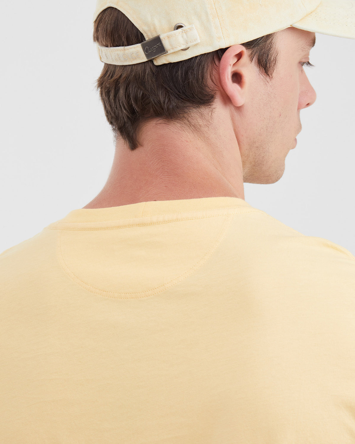 Slim-fit short-sleeve t-shirt in yellow with a minimalist chest graphic. Features decorative stitch accents on the side, ribbed collar, and woven label for subtle branding.