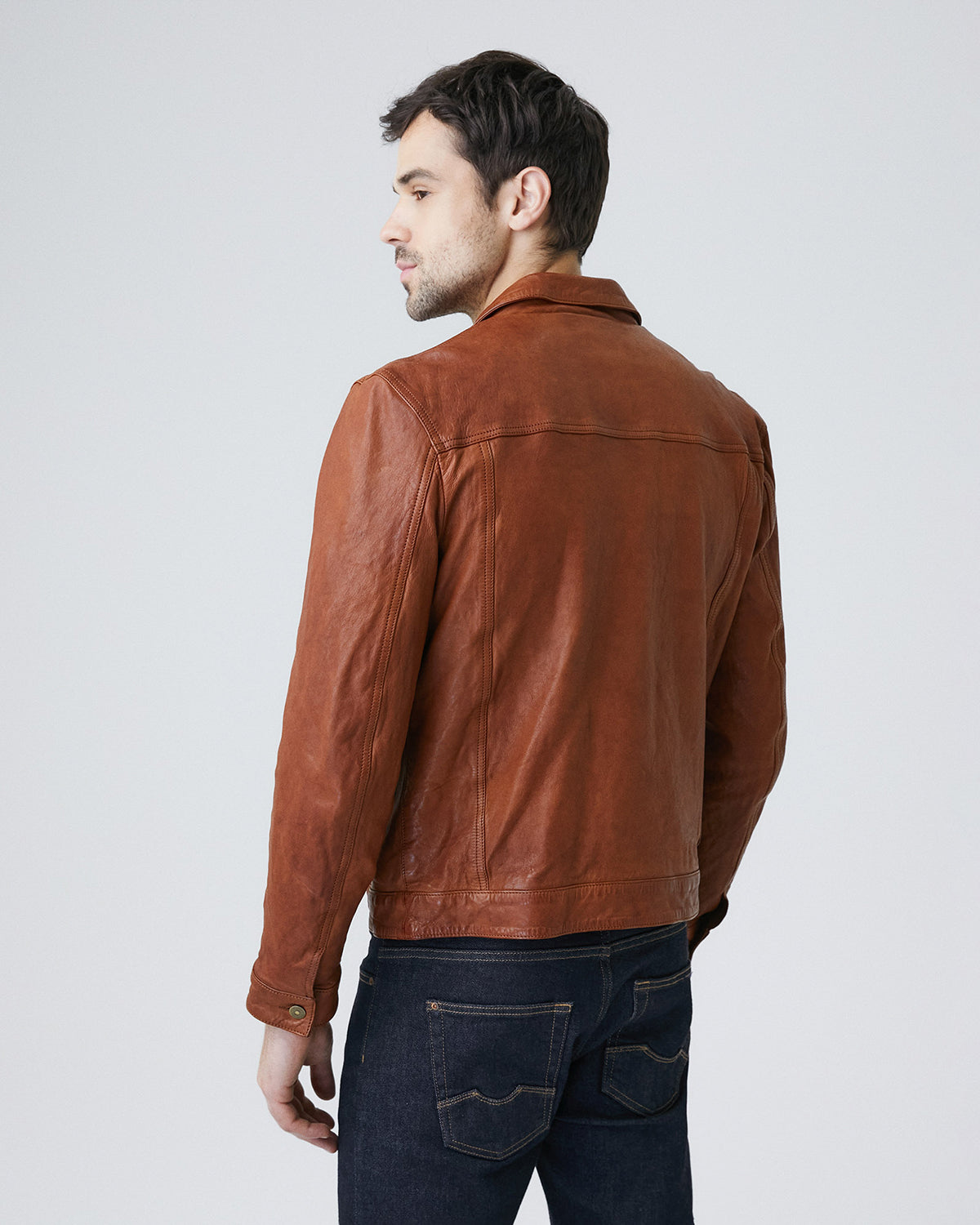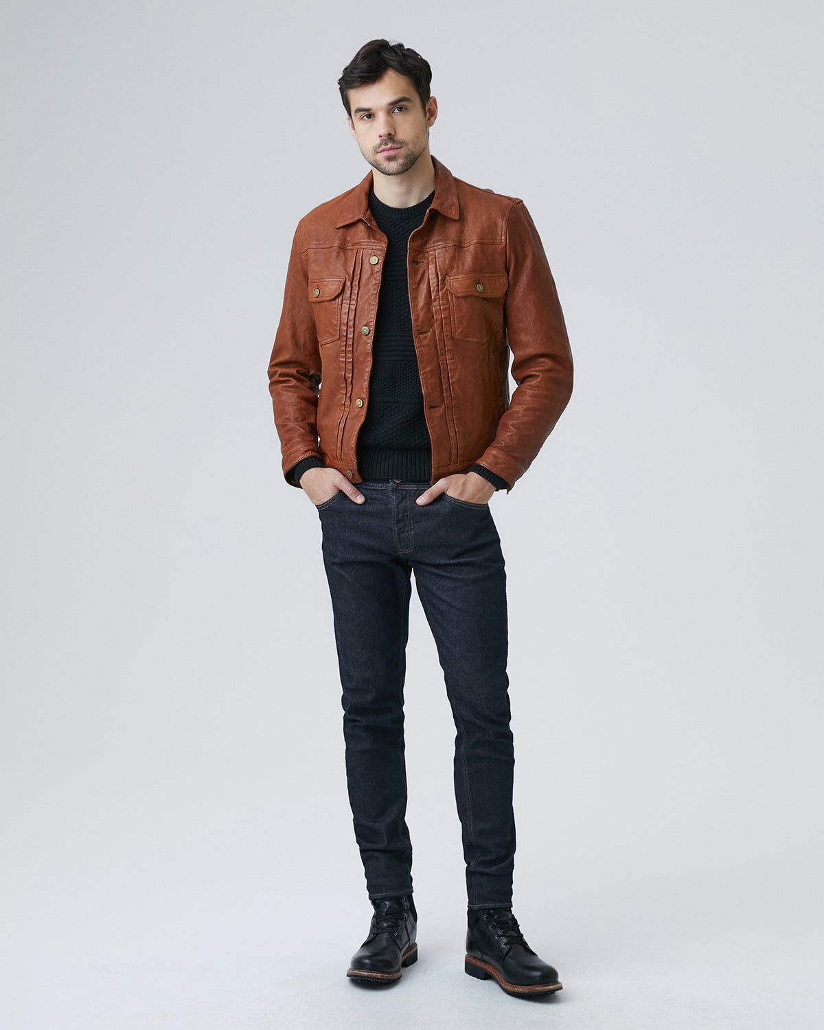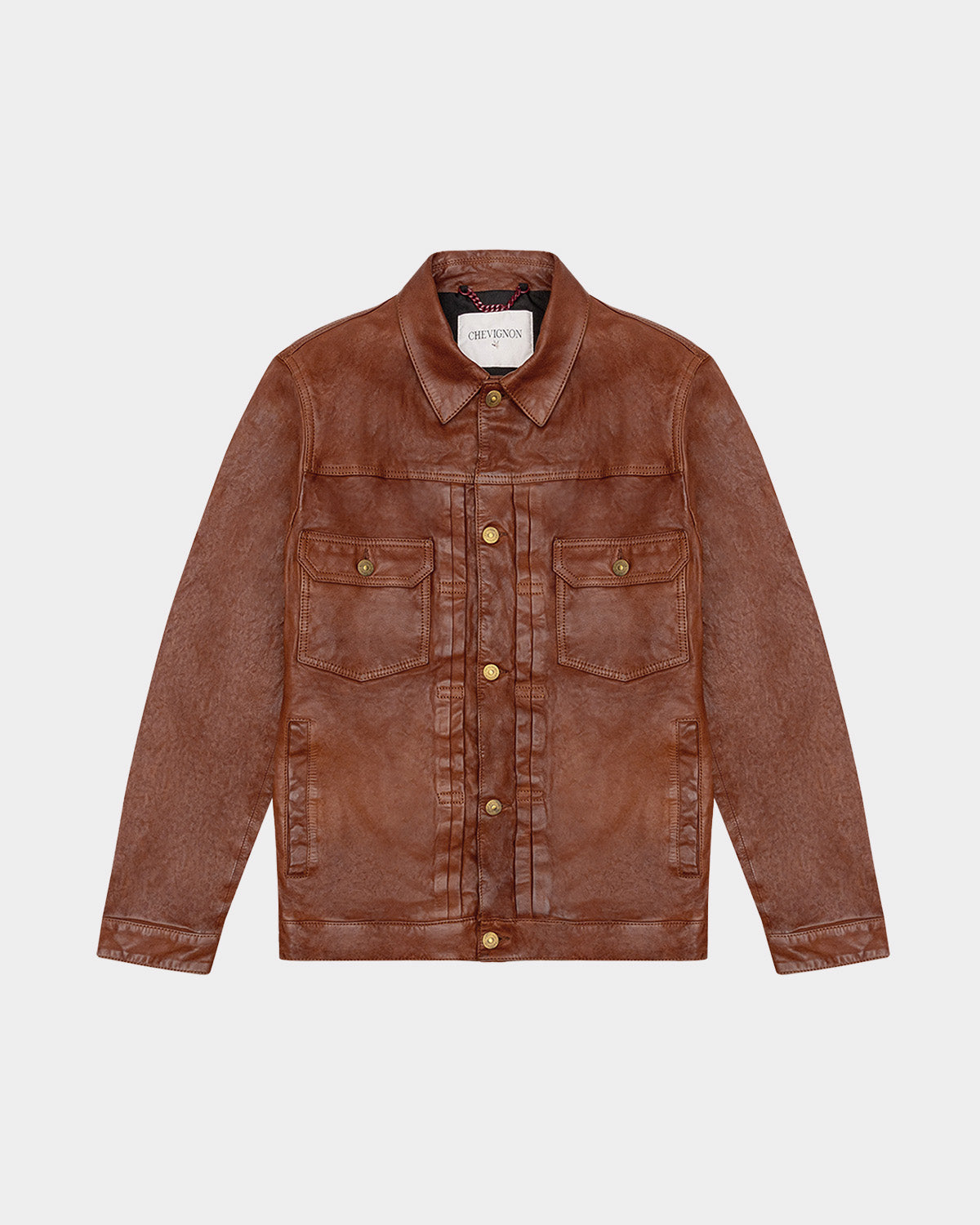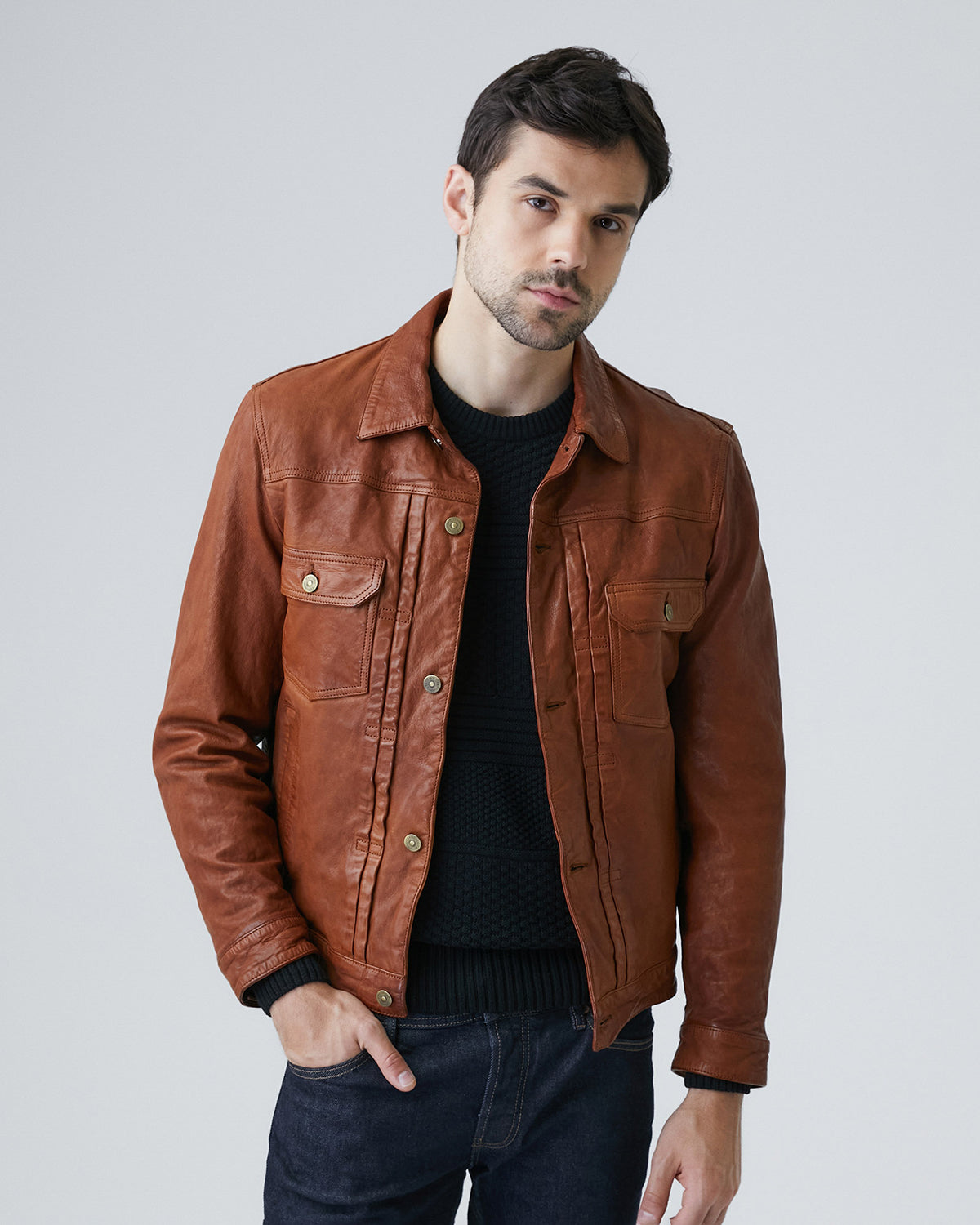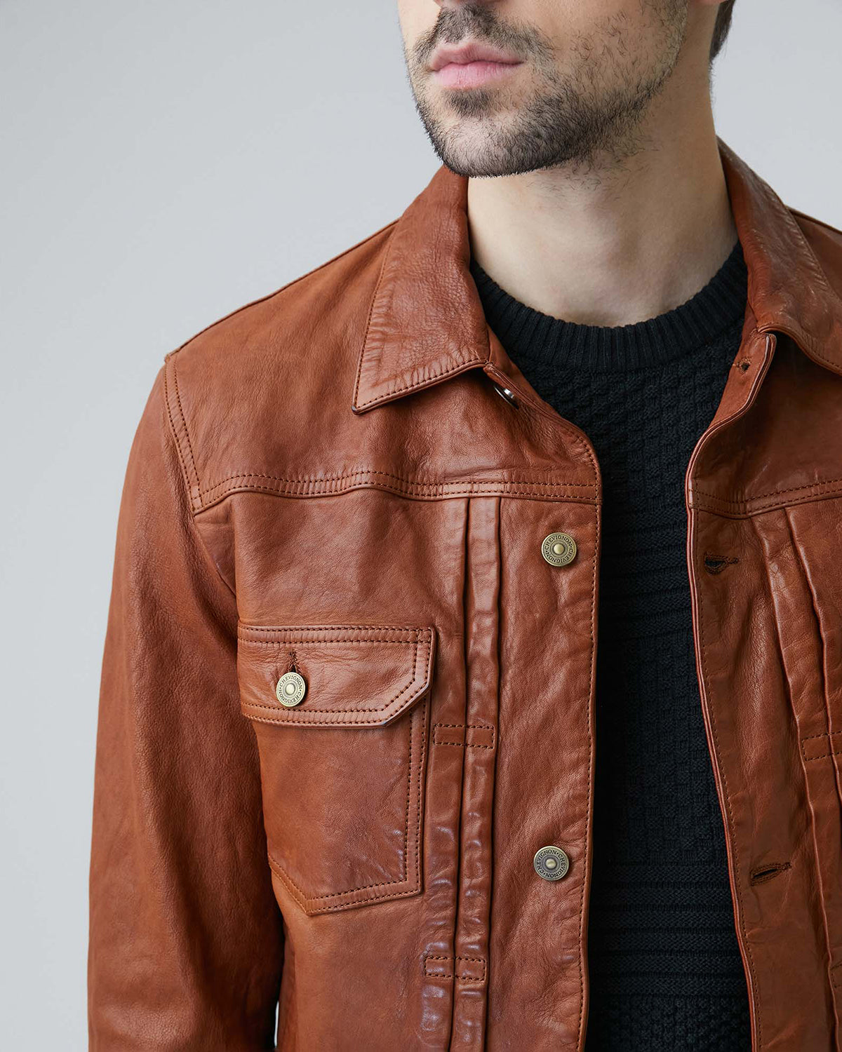 • Chest patch pockets reinforce the classic American trucker silhouette, while golden buttons offer a striking contrast against the rich leather.