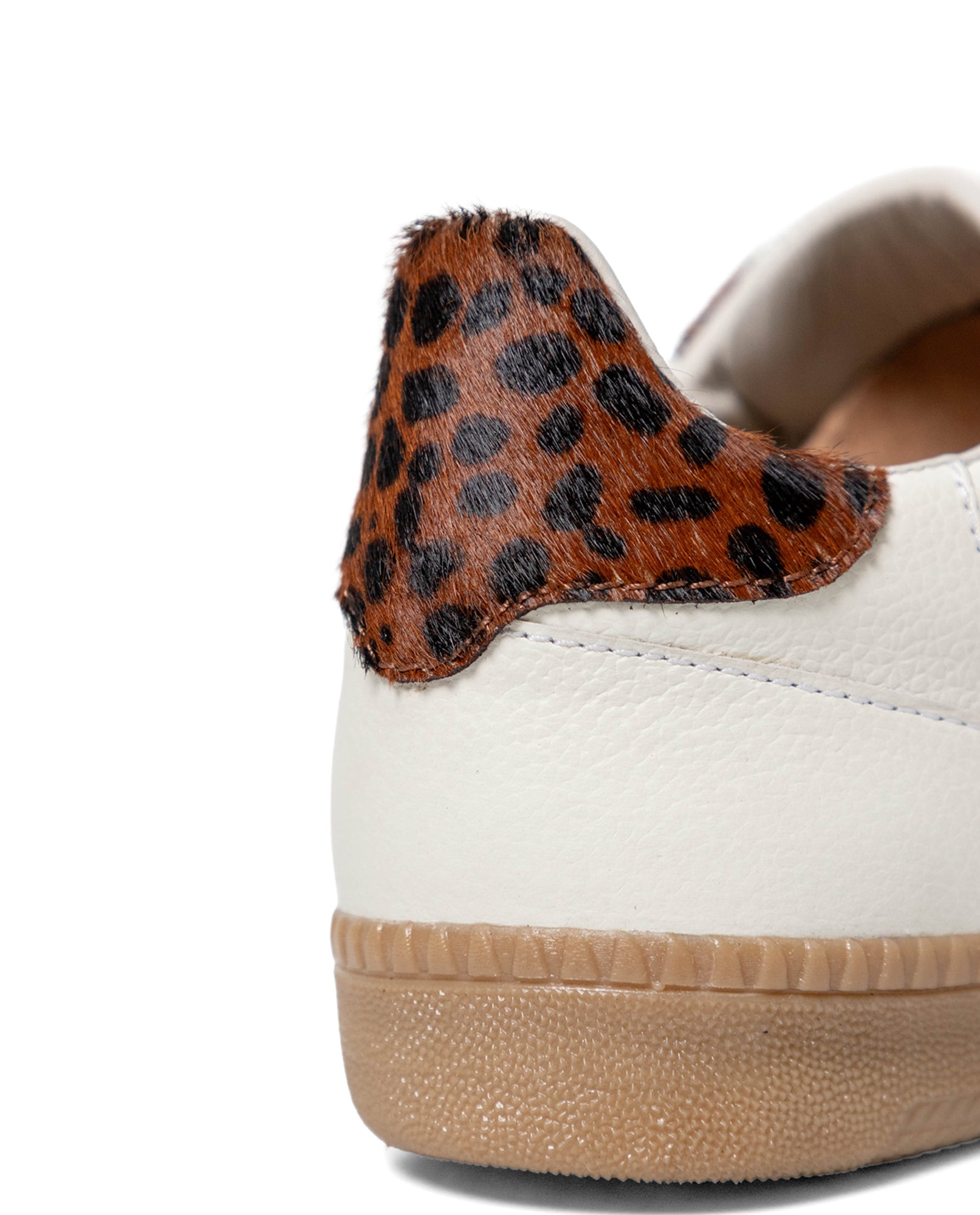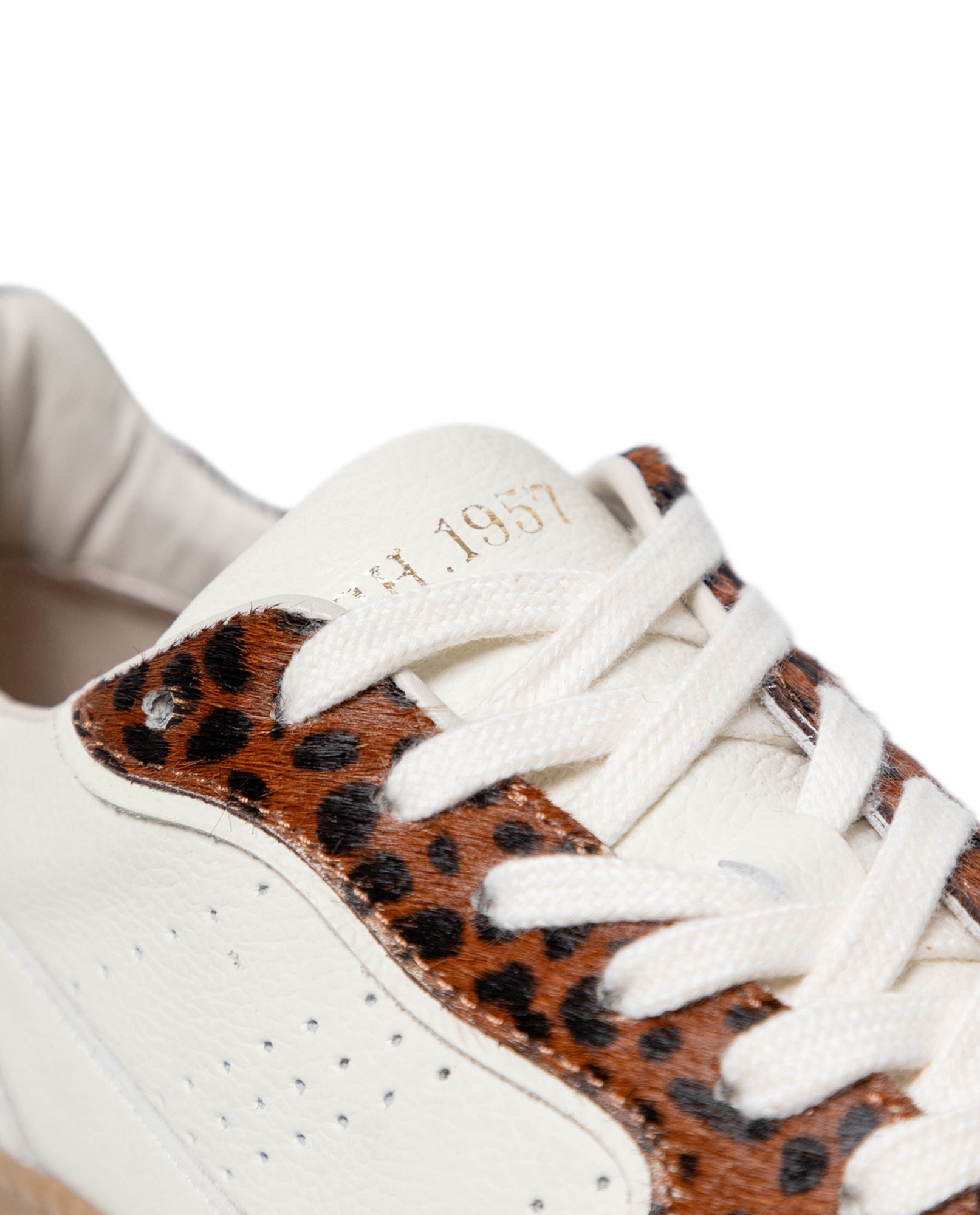 • Short retro-style sneakers, crafted in a sophisticated combination of full-grain leather with a marked grain and natural cowhide with animal print, providing texture and character to the silhouette. • Featuring a classic and comfortable last, they incorporate cotton laces and internal padding in the back for added comfort during wear. • They are fully lined in leather, ensuring a premium feel and greater durability. • The 2 cm honey-colored rugged rubber sole offers traction and a vintage look. • As a final touch, they feature the CH1957 marking in gold foil on the tongue, a detail that reinforces their identity with a discreet touch of luxury.